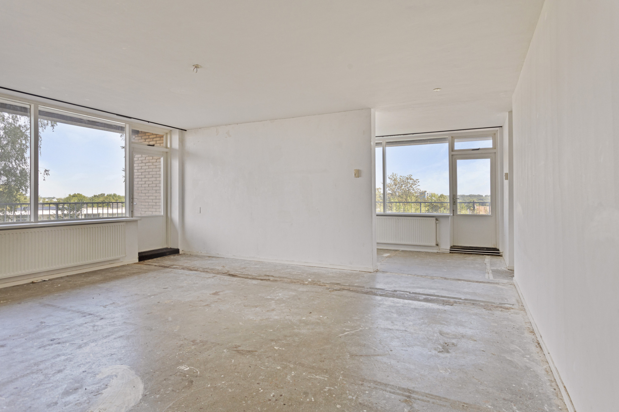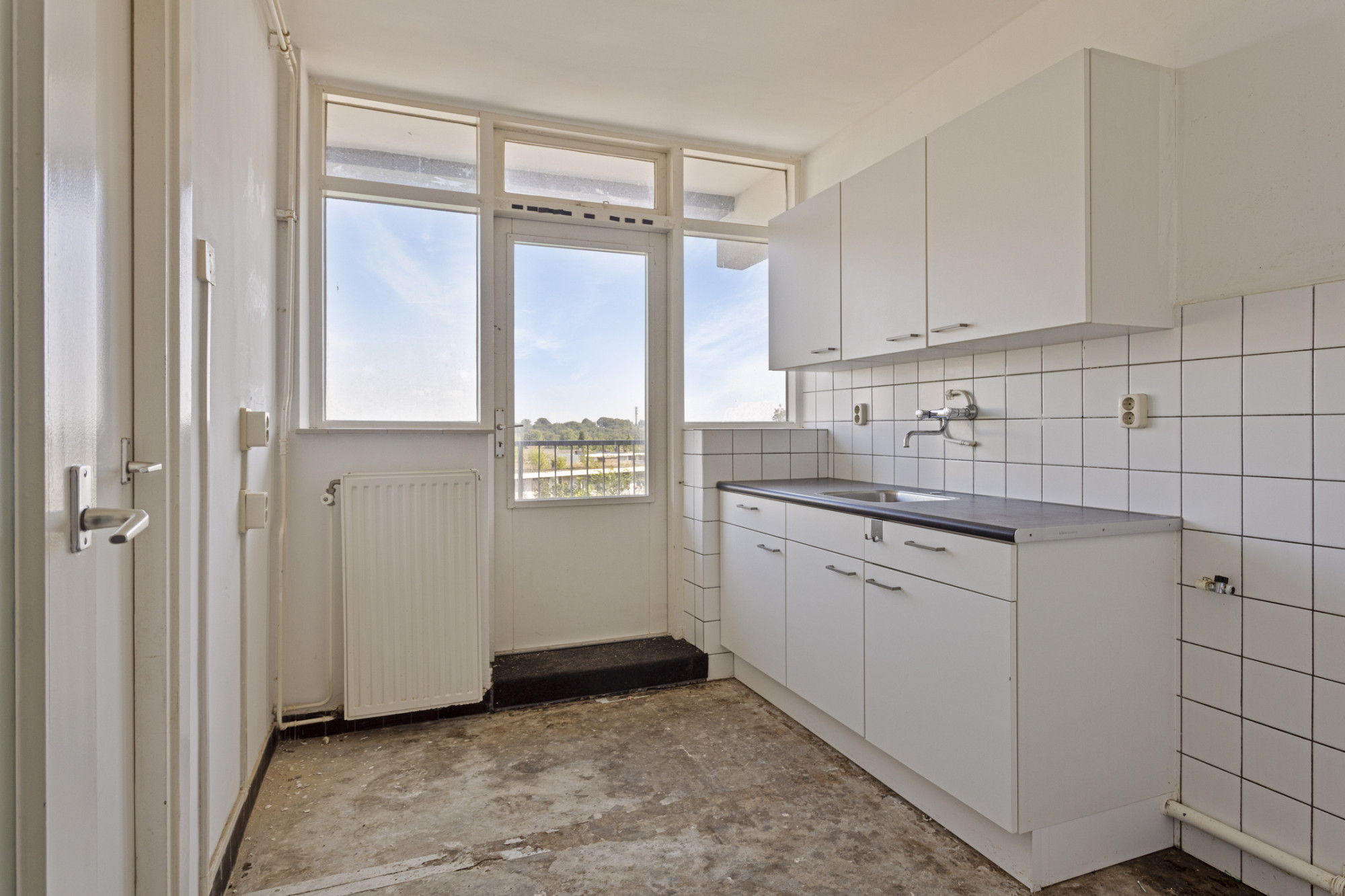 Ruime woonkamer met separate eetkamer beiden met toegang tot een balkon. Vanuit de eetkamer en centrale hal toegang tot de keuken met witte keukeninstallatie in hoekopstelling diverse onder- en bovenkasten.