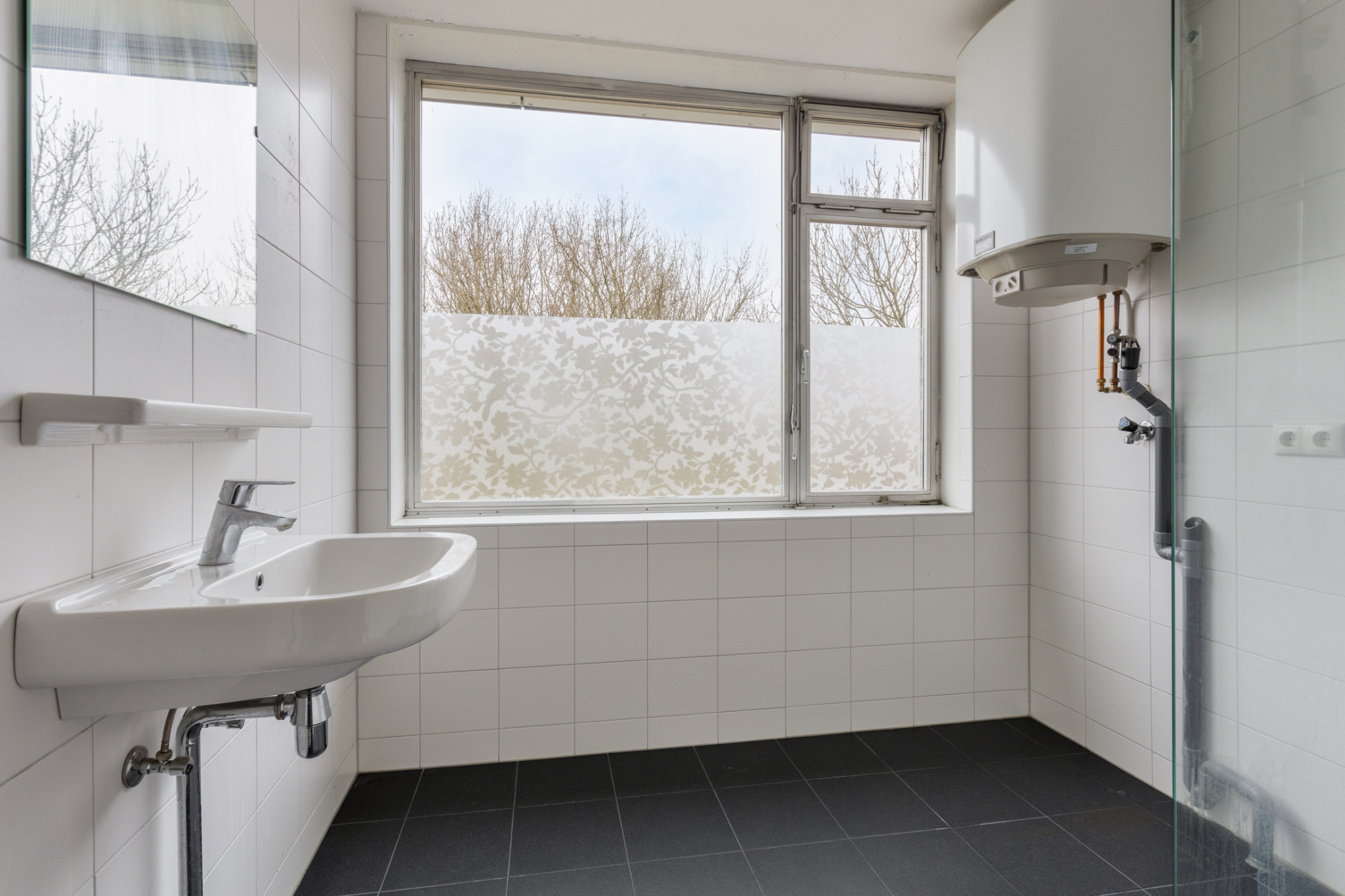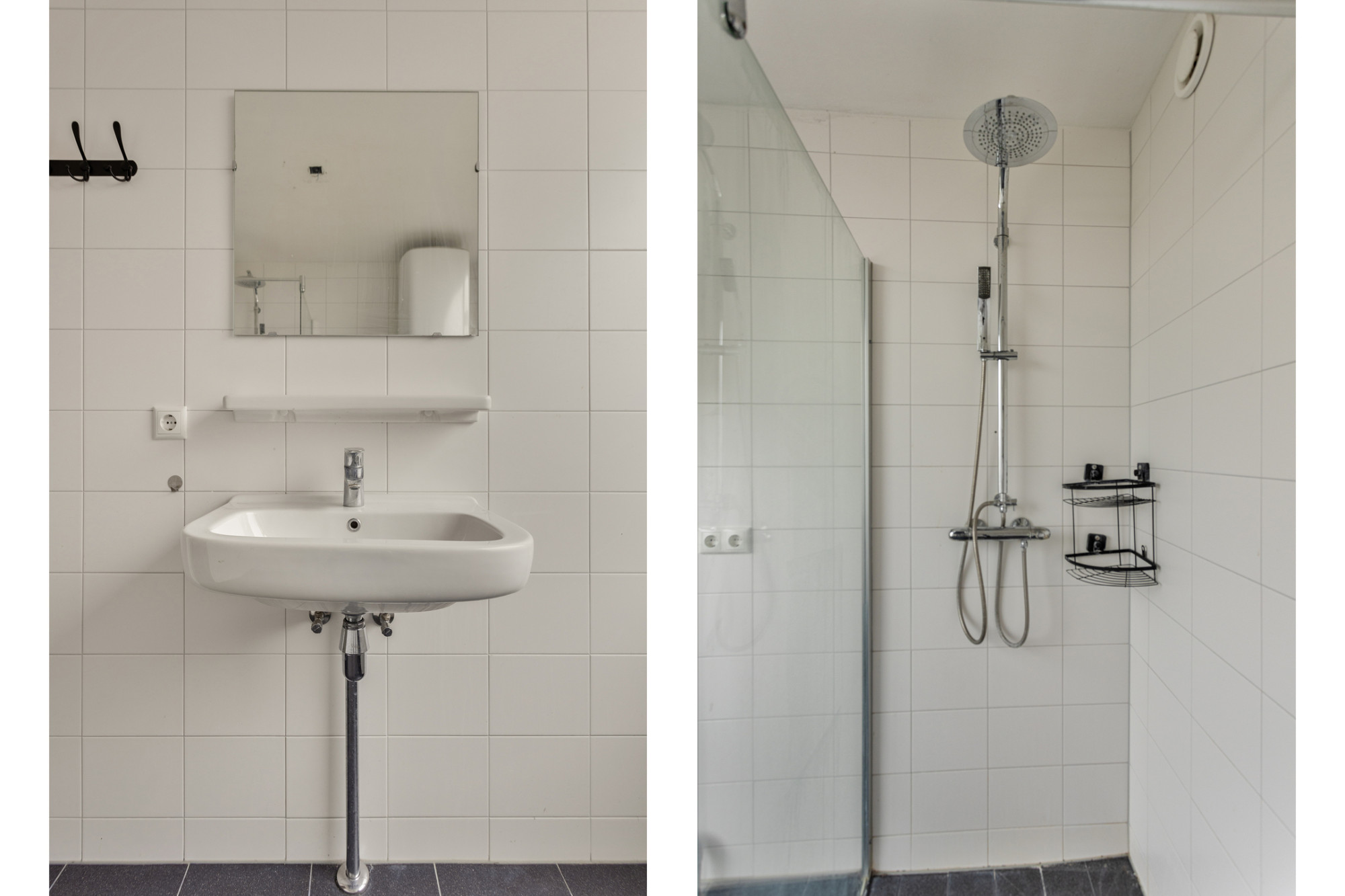 Badkamer met douche en vaste wastafel.