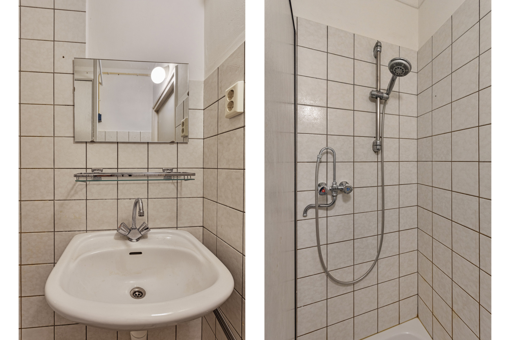 Badkamer (1.53 x 1.33 m) met douche en vaste wastafel.