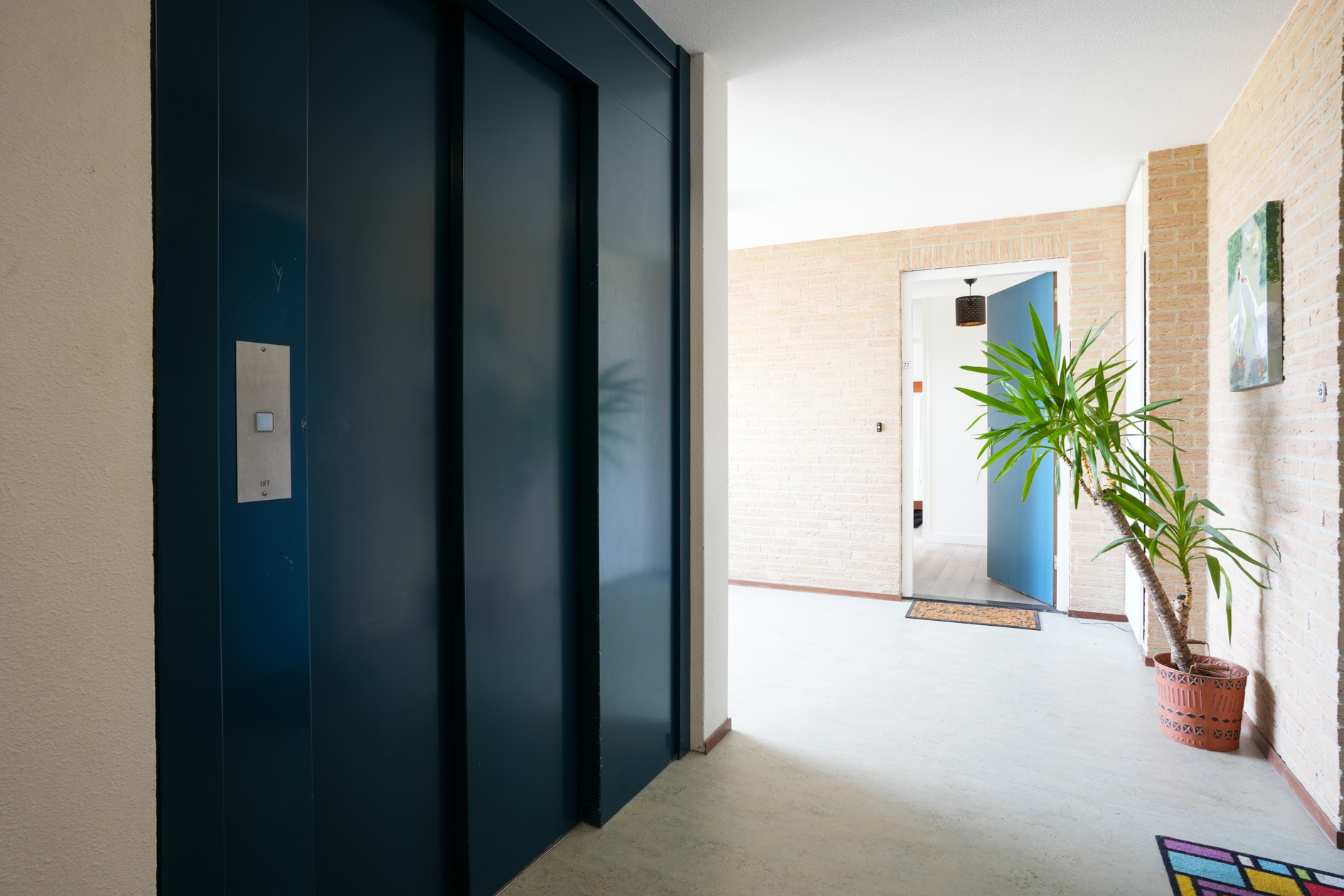 Representative entrance with doorbells and mailboxes. Central hall with staircase and elevator. Access to the central storage room with private storage space (approx. 5 m²).