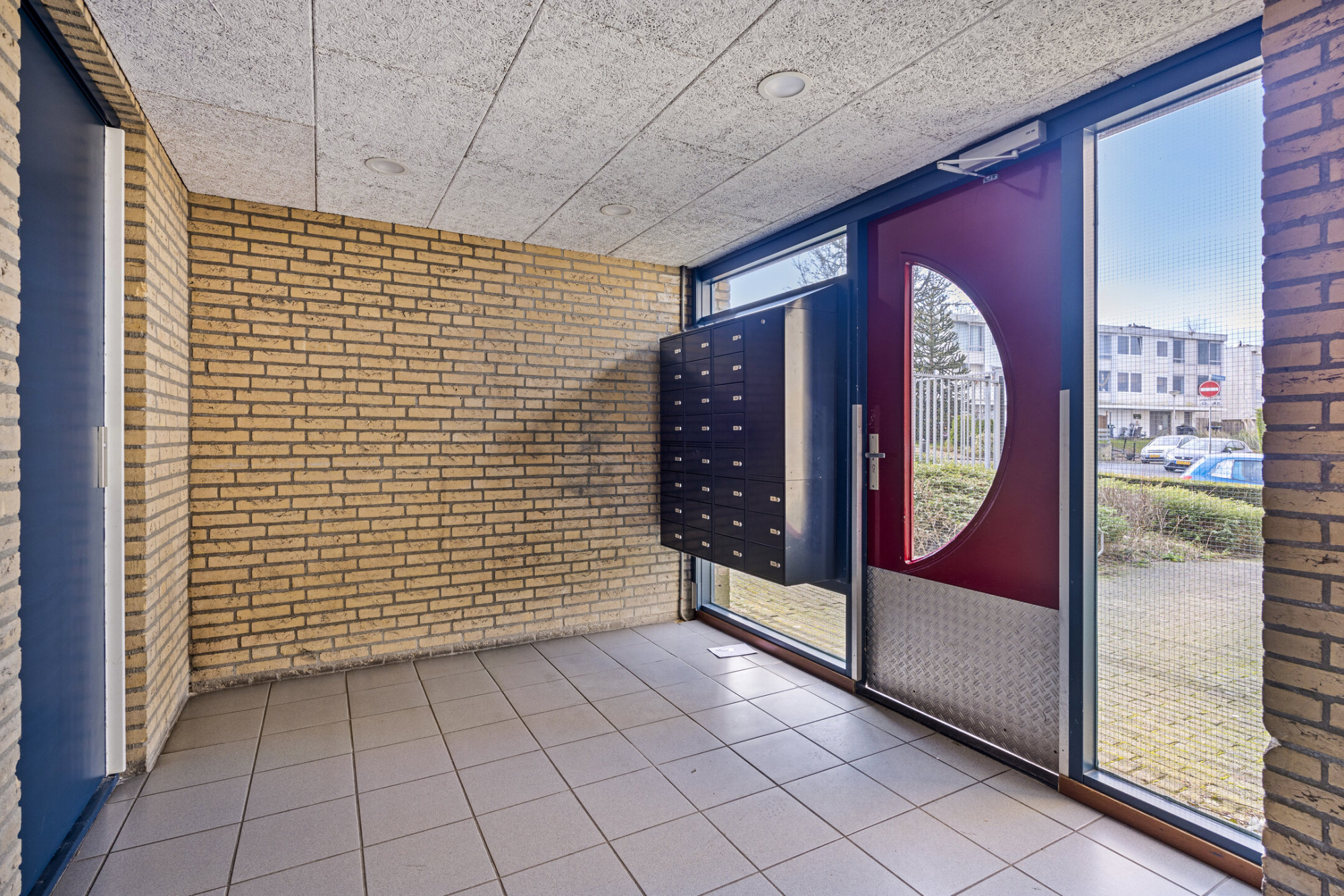 Central entree met brievenbussen, bellentableau en liftinstallatie.