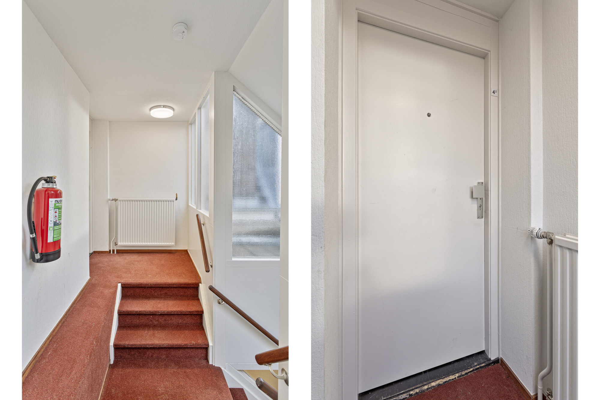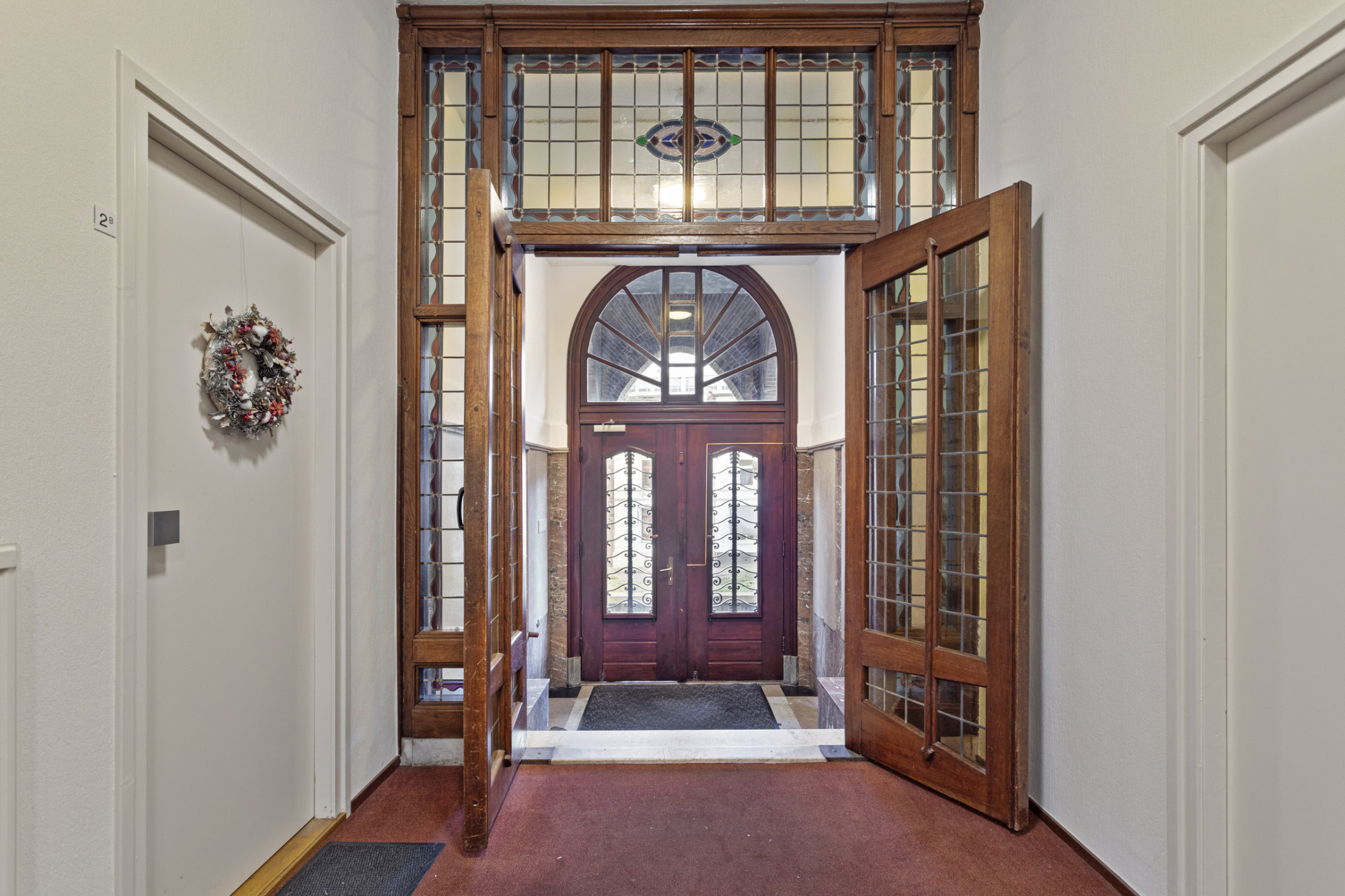 Middels hoger gelegen overdekte centrale entree met bellenplateau en brievenbussen toegang tot de fraaie hal, separate buitenberging en eigen parkeerplaats.