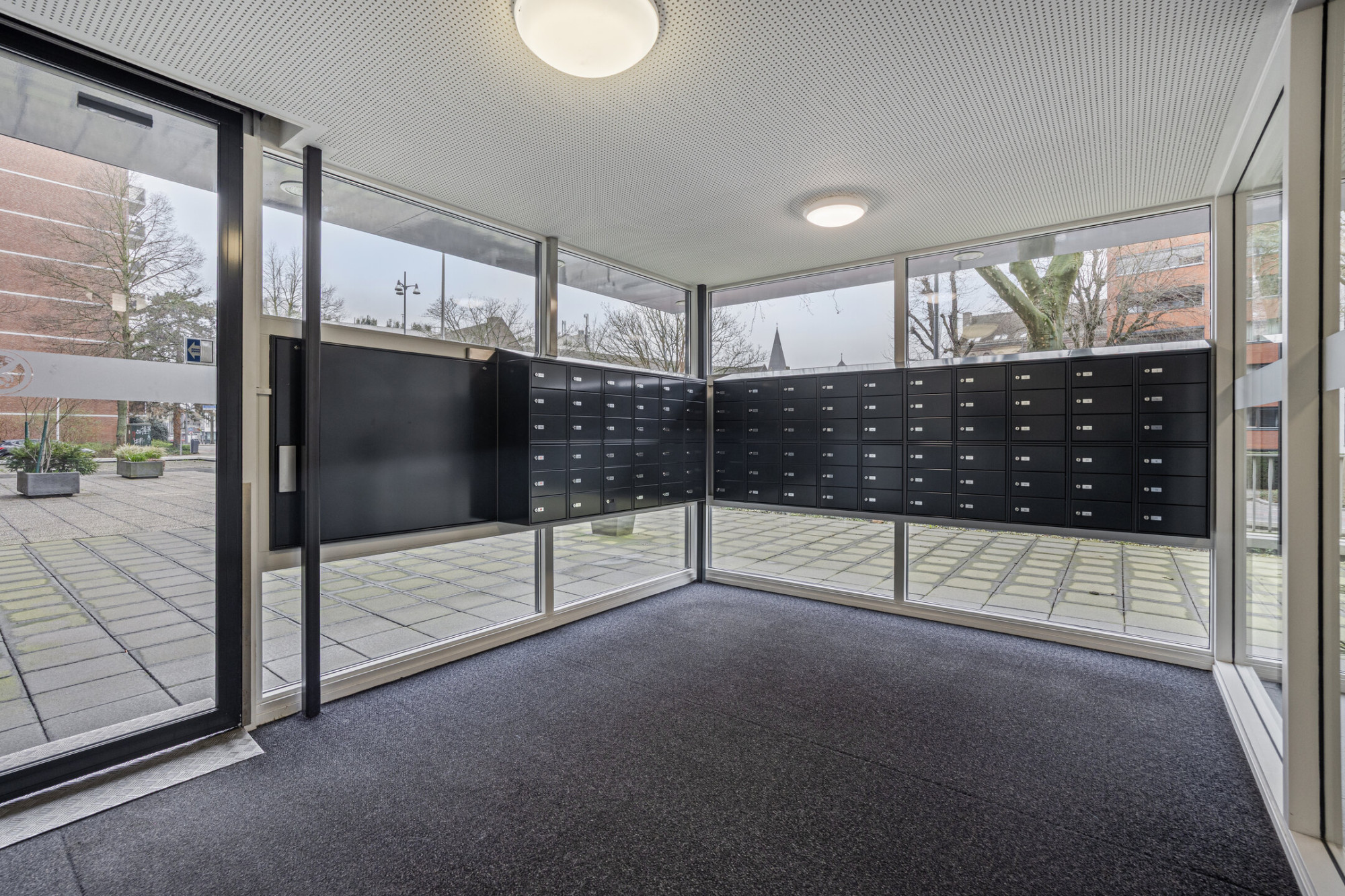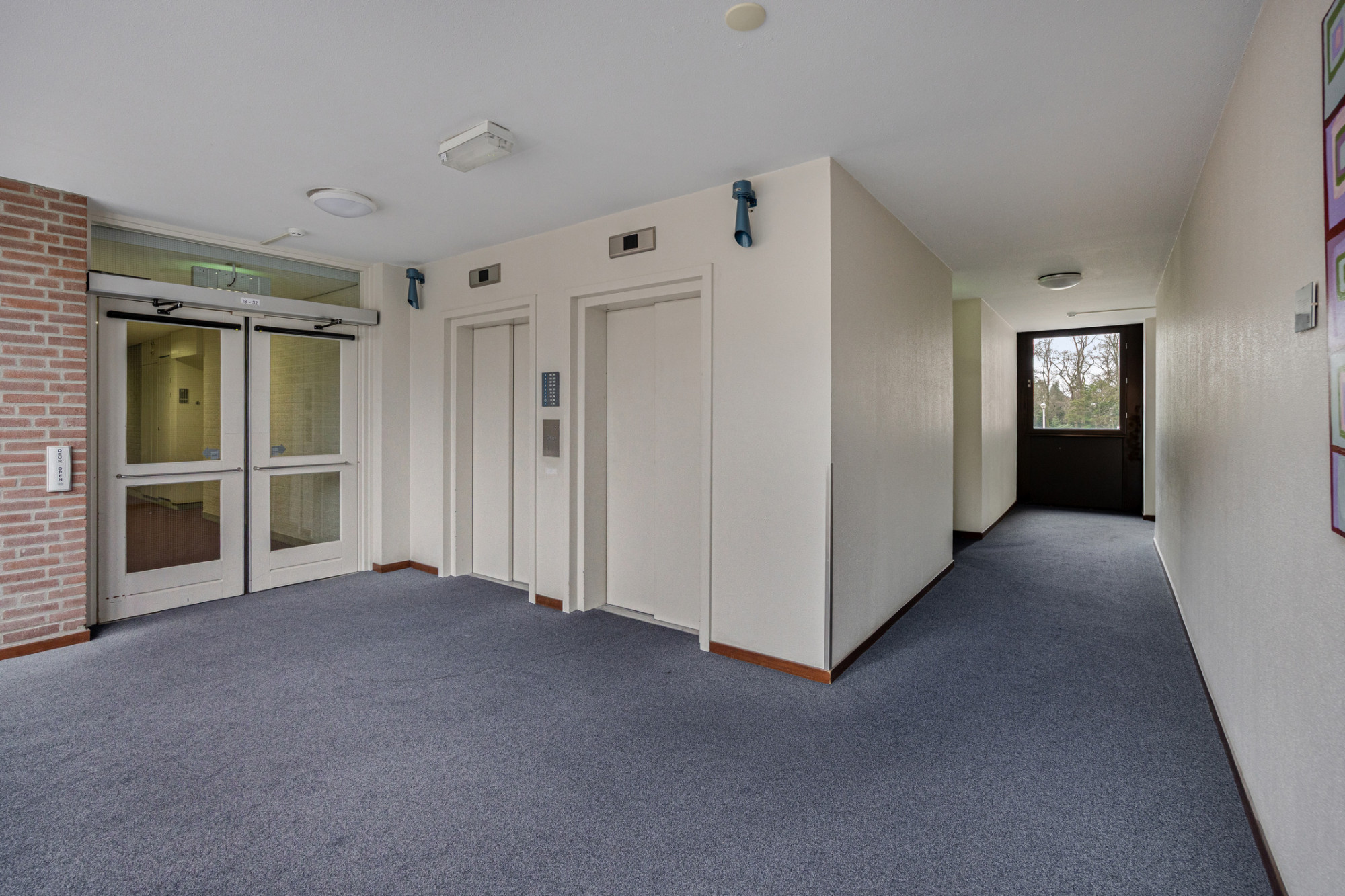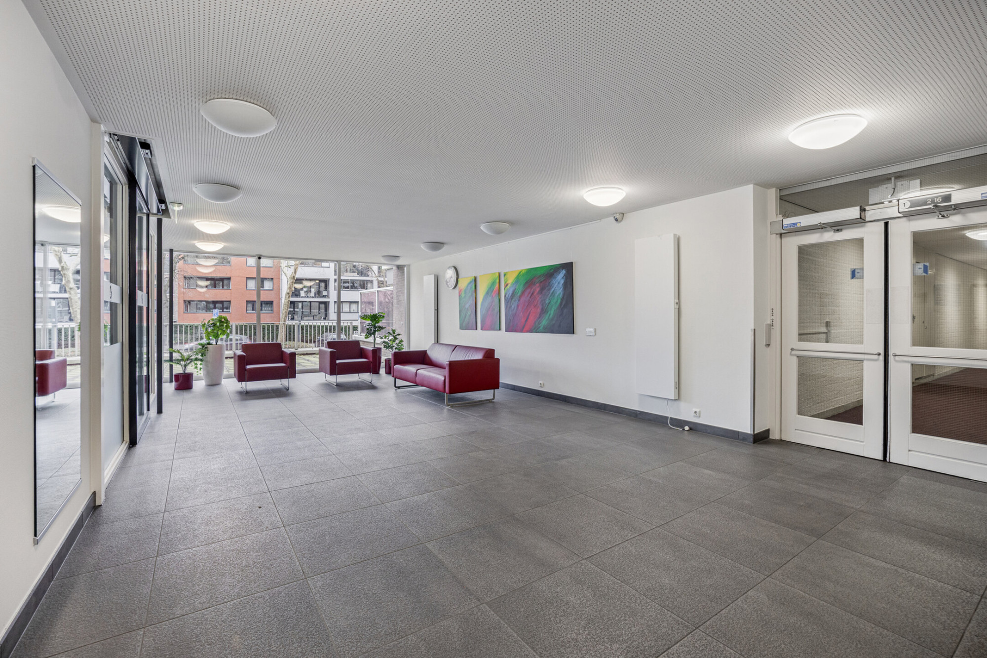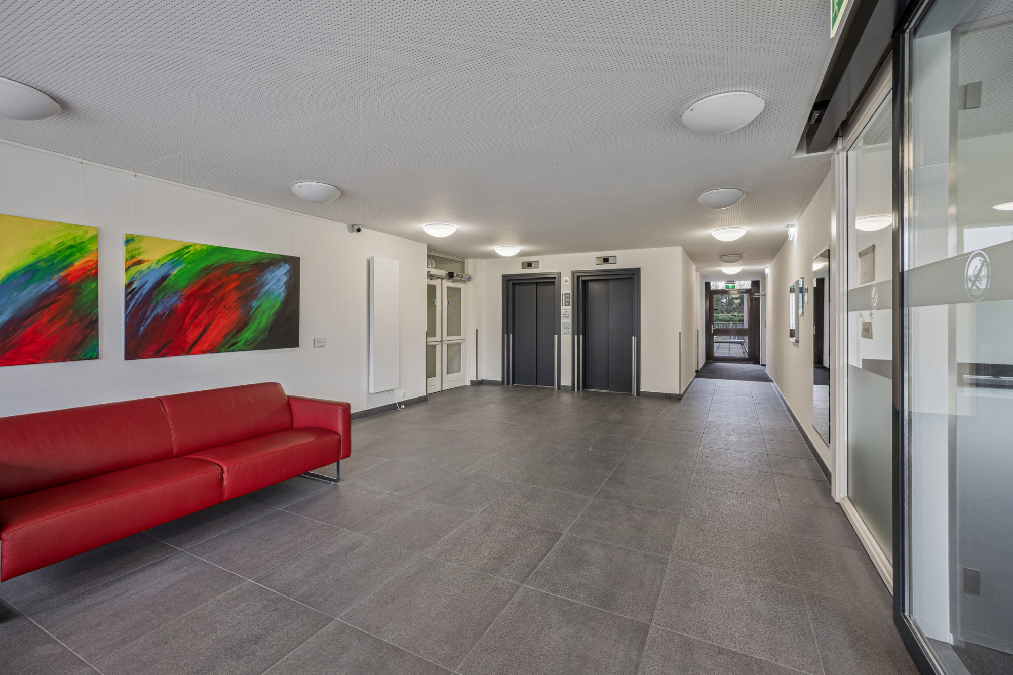 Representatieve ontvangst hal met brievenbussen en toegang naar de dubbele liften.