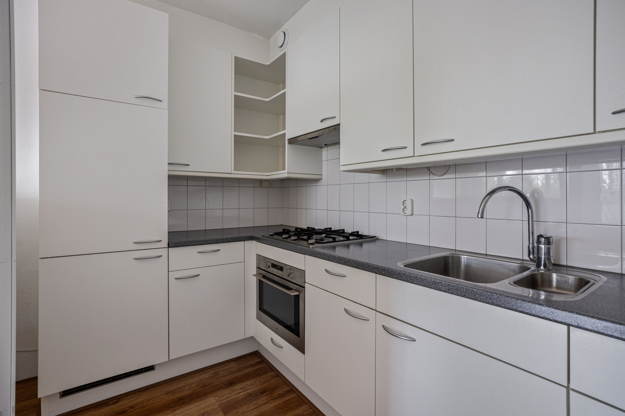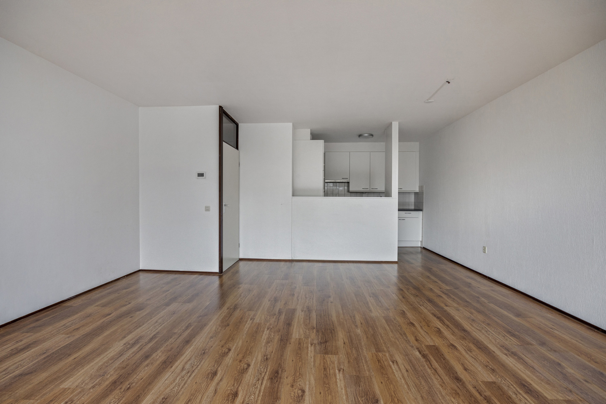 Woonkamer (7.95 x 5.21/3.77 m) voorzien van laminaatvloer en met toegang naar de open keuken met keurige keukeninstallatie met vele handige en vernuftige opbergmogelijkheden en apparatuur te weten: 4 -pits inductiekookplaat, combi-oven, afzuigkap en koelkast met vriesvak.