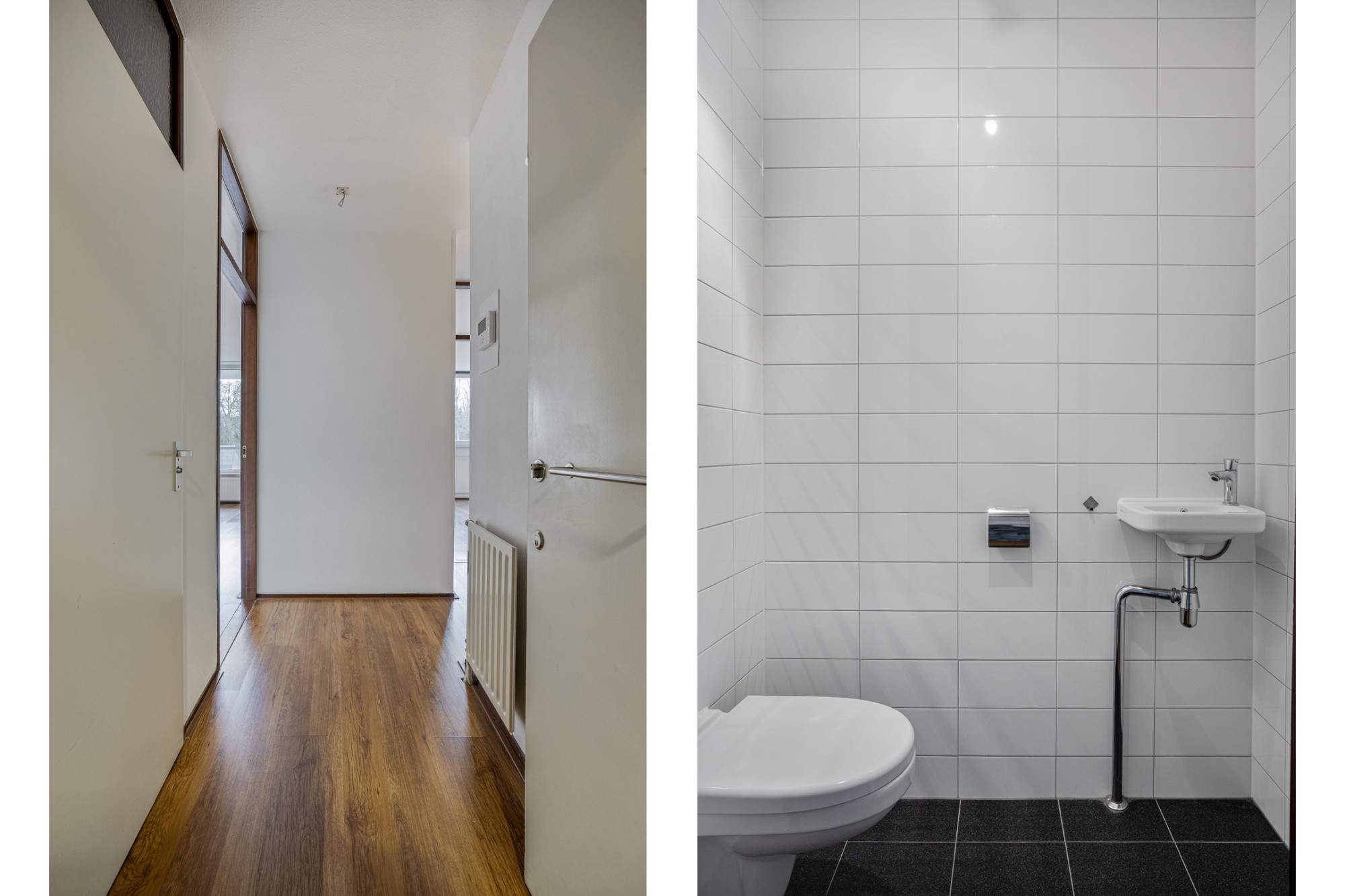 Modern afgewerkt en deels betegeld toilet (2021) met zwevend toilet en fonteintje.