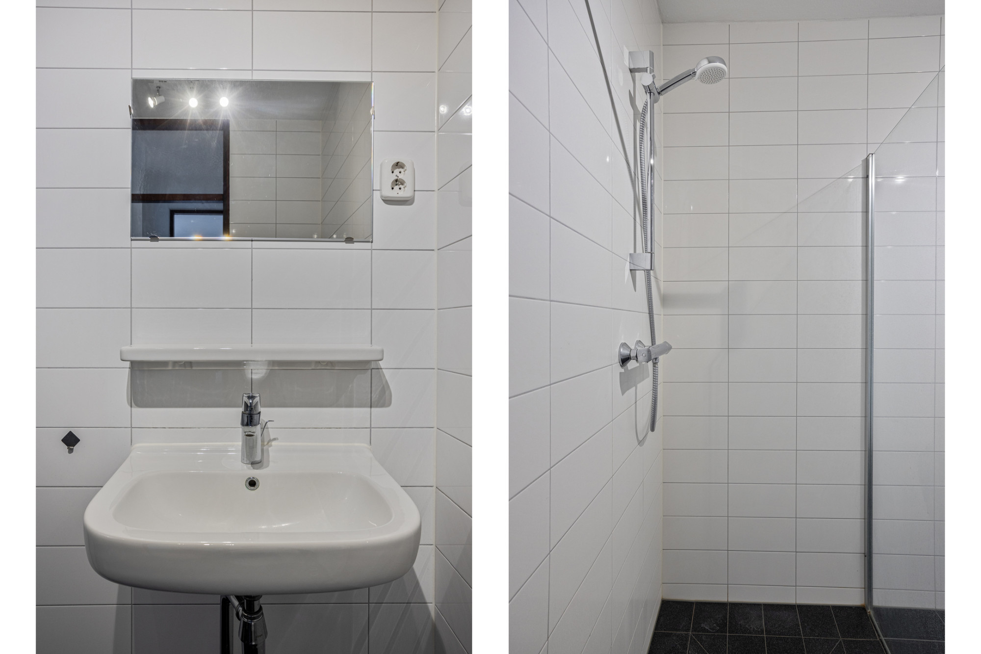 Geheel betegelde modern afgewerkte badkamer uit 2021 (2.26 x 1.80 m) met ruime inloopdouche, dubbele vaste wastafel en witgoed aansluiting.