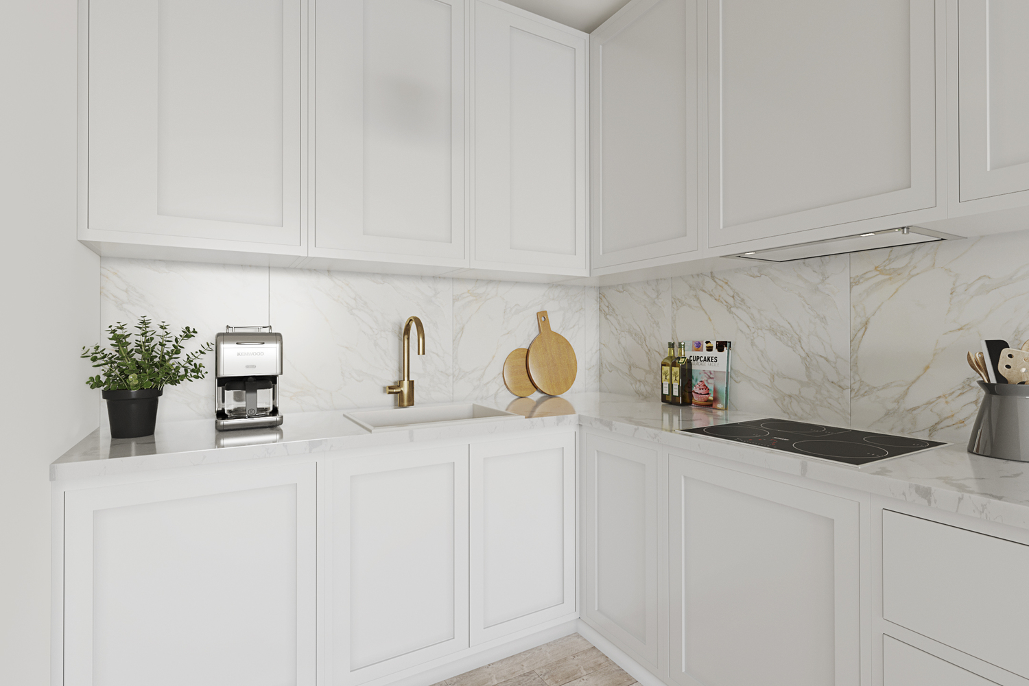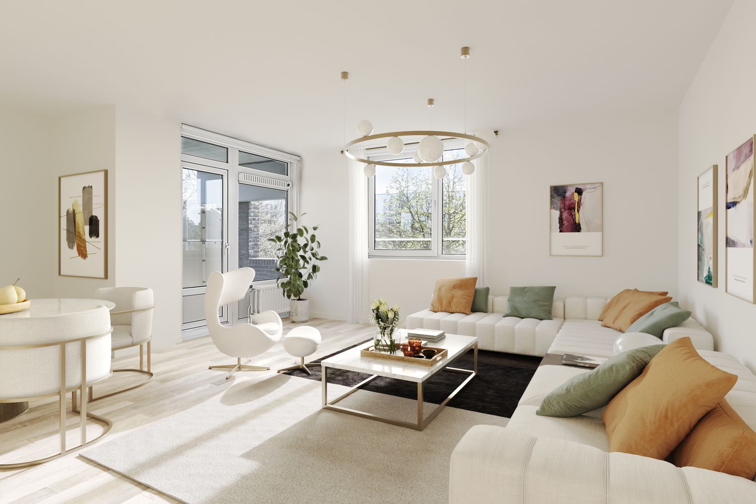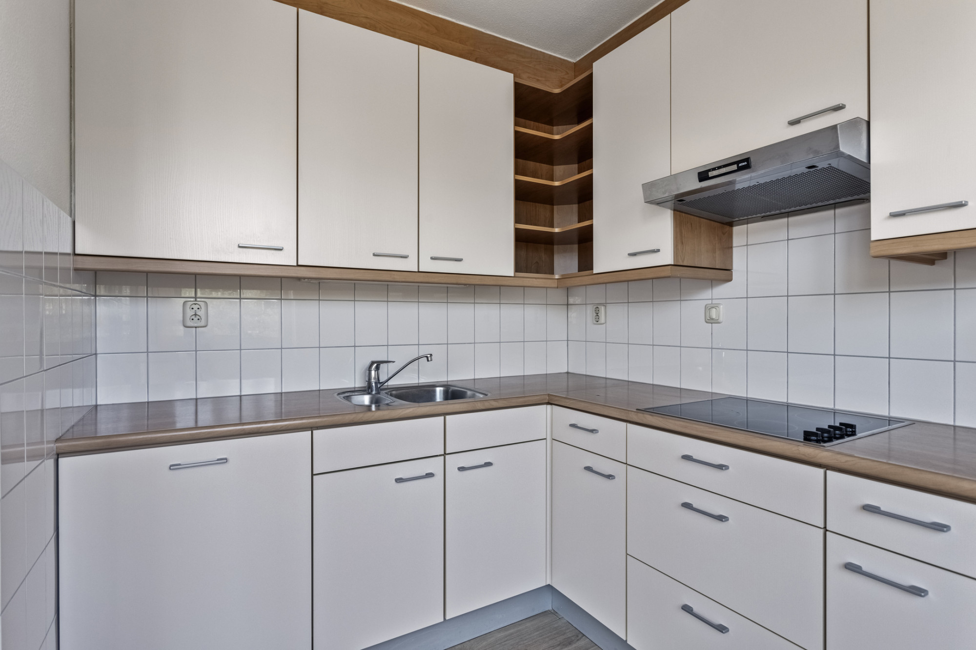 Woonkamer met toegang tot het balkon; half-open keuken met keuken installatie in hoekopstelling met diverse onder- en bovenkasten en inbouwapparatuur.