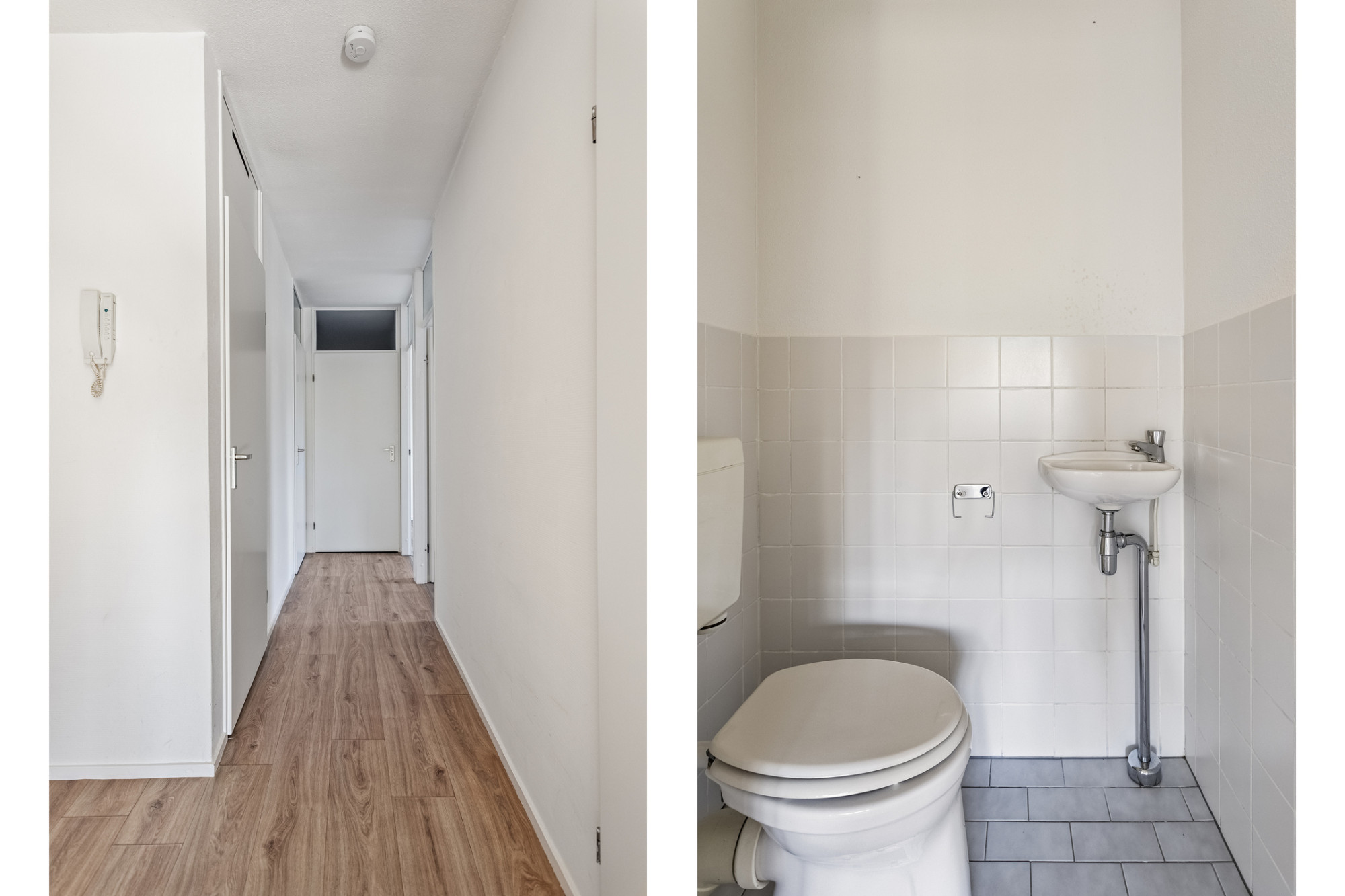 Verdeelhal met toegang tot de appartementen. Entree/hal met toegang tot alle vertrekken, deels betegelde toiletruimte en fonteintje en techniekruimte alwaar CV installatie.