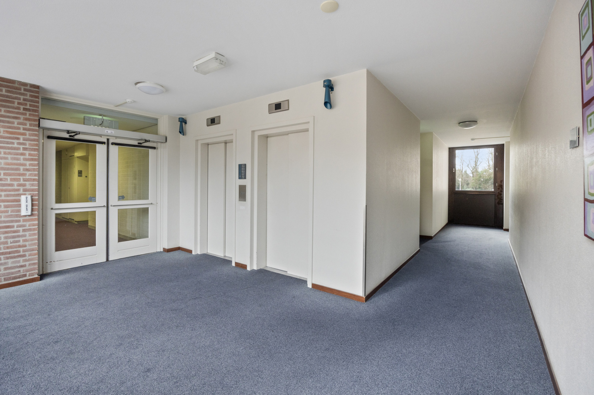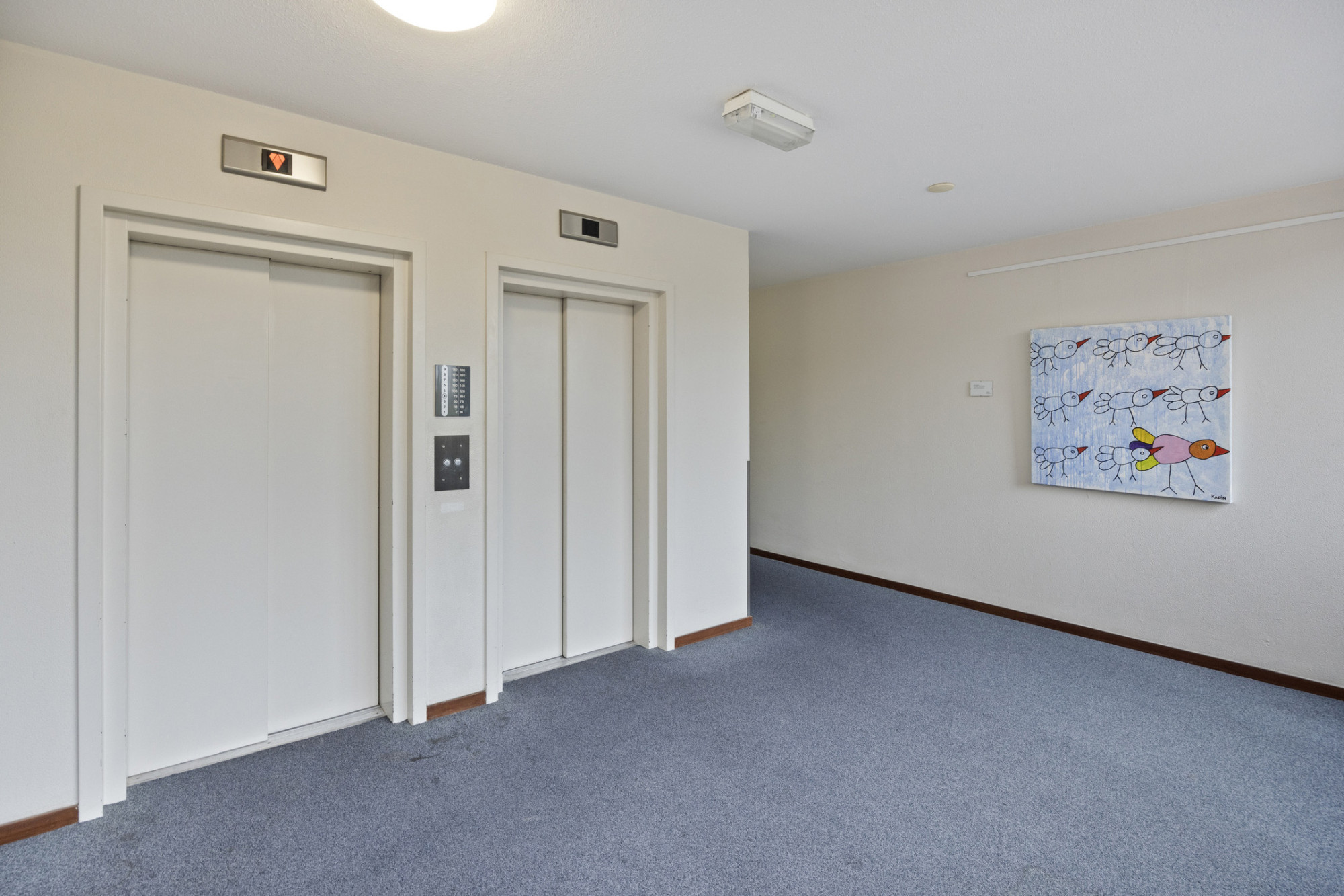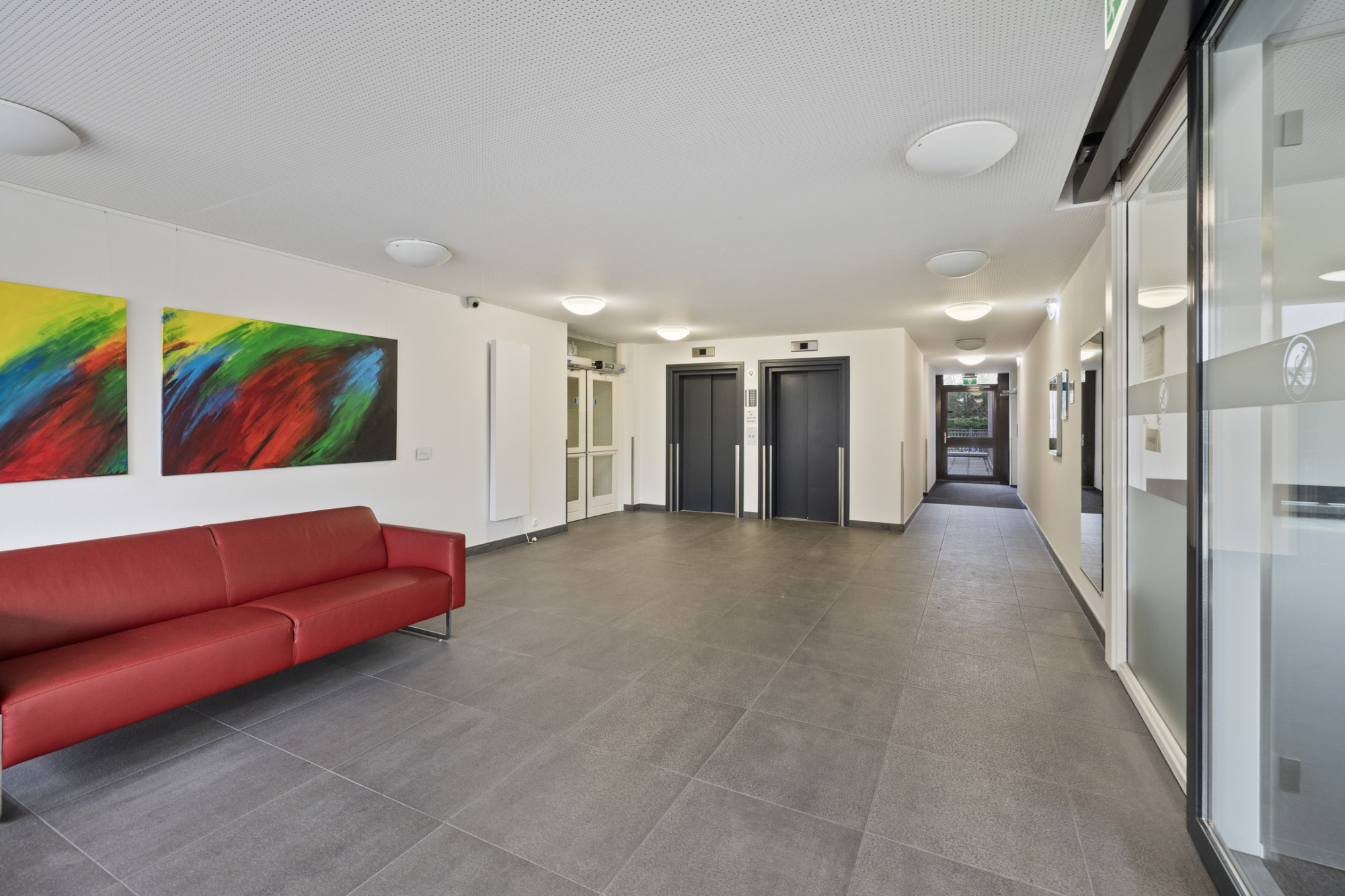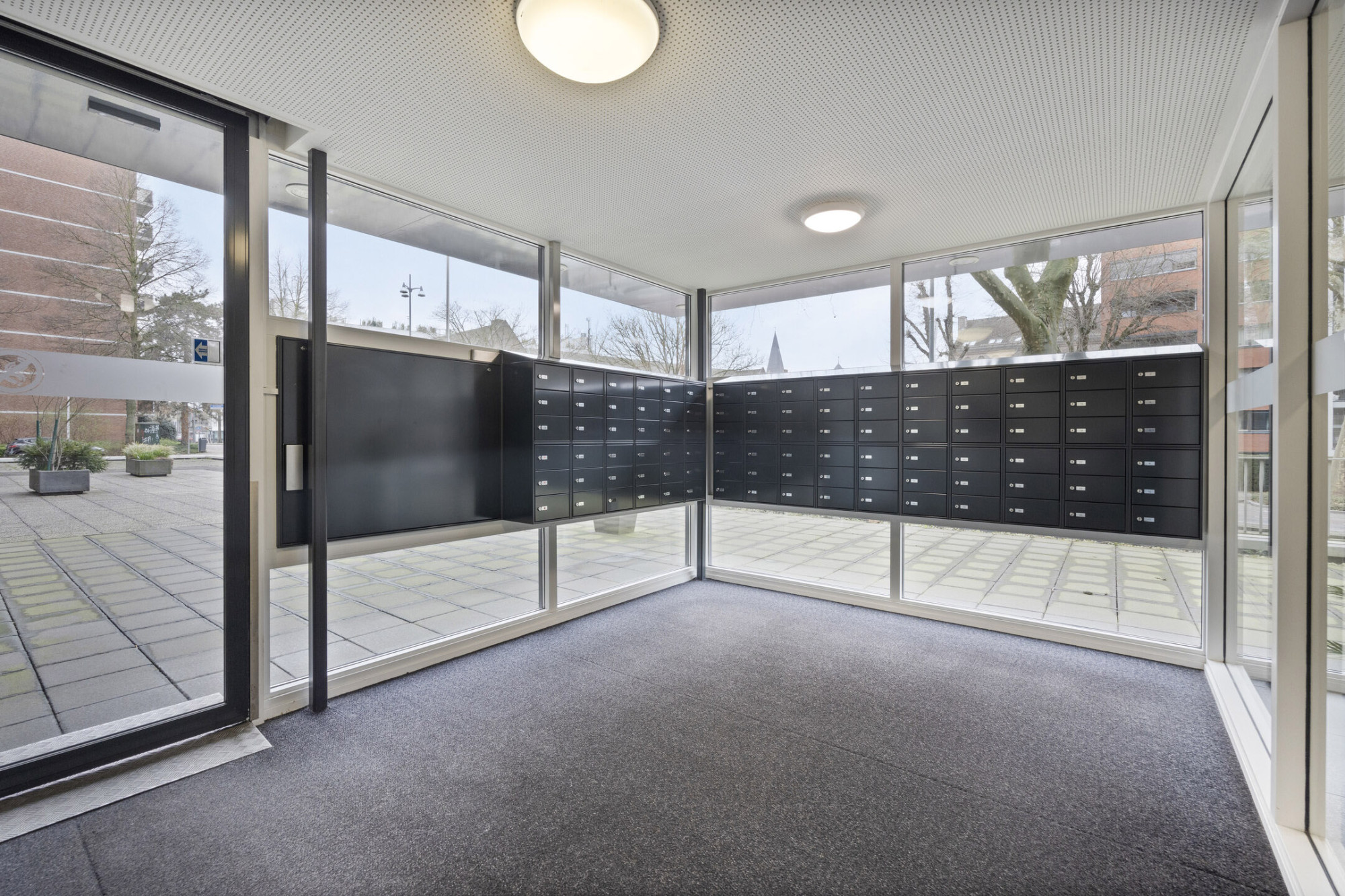 Representatieve ontvangst hal met brievenbussen en toegang naar de dubbele liften.