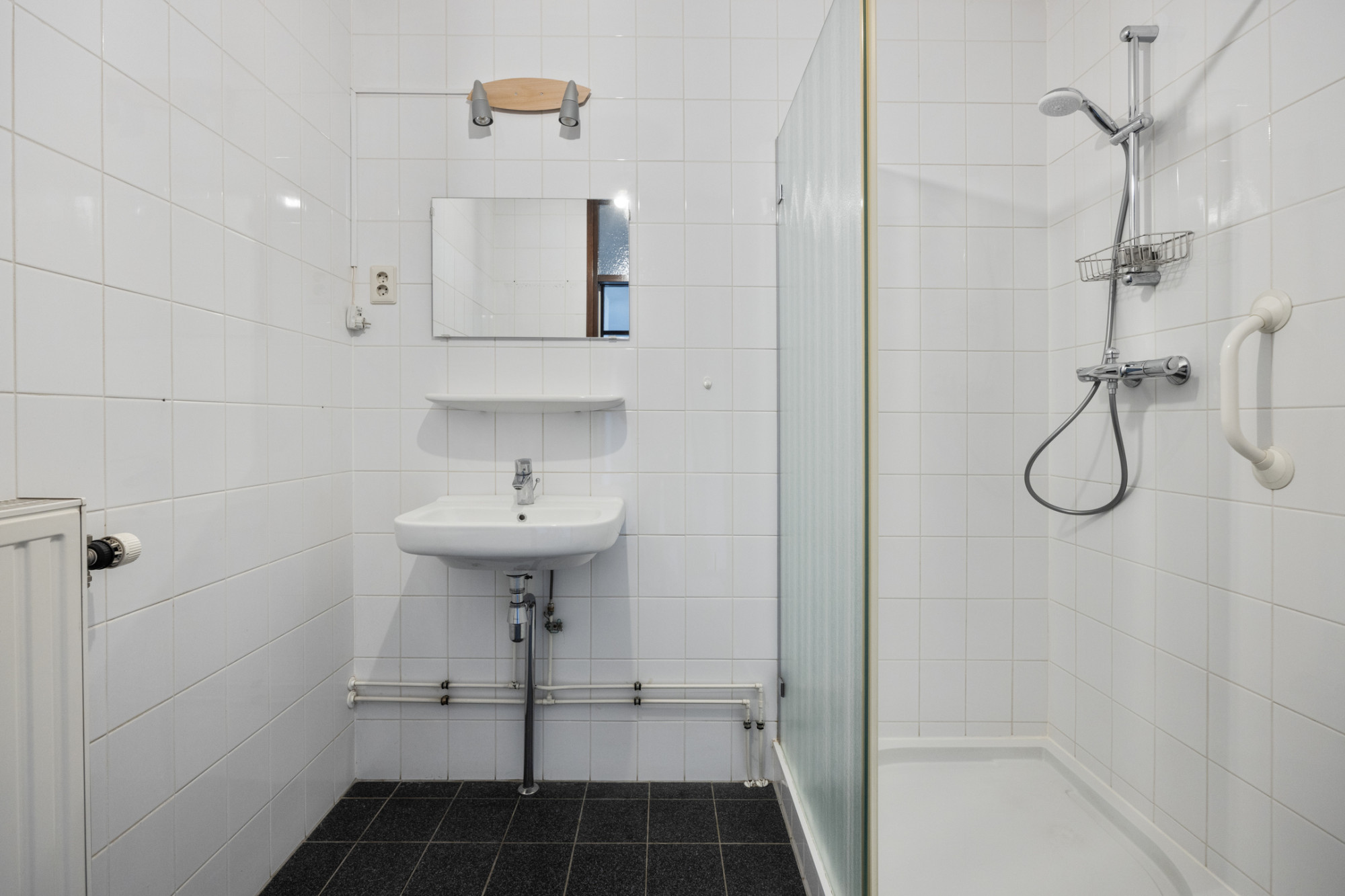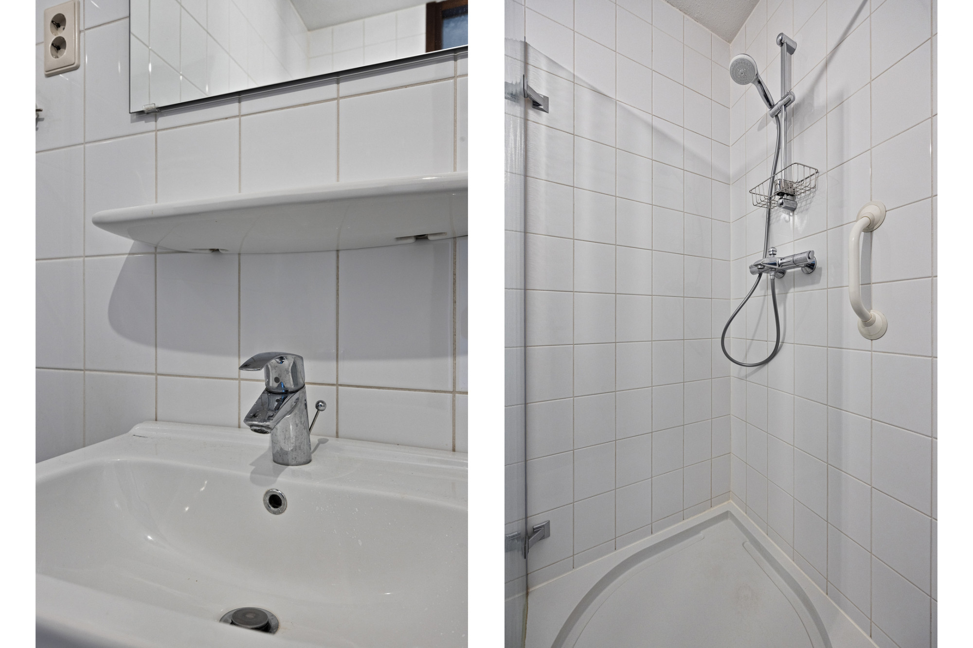 Geheel betegelde modern afgewerkte badkamer (2.23 x 1.76 m) met ruime inloopdouche en vaste wastafel met spiegel.