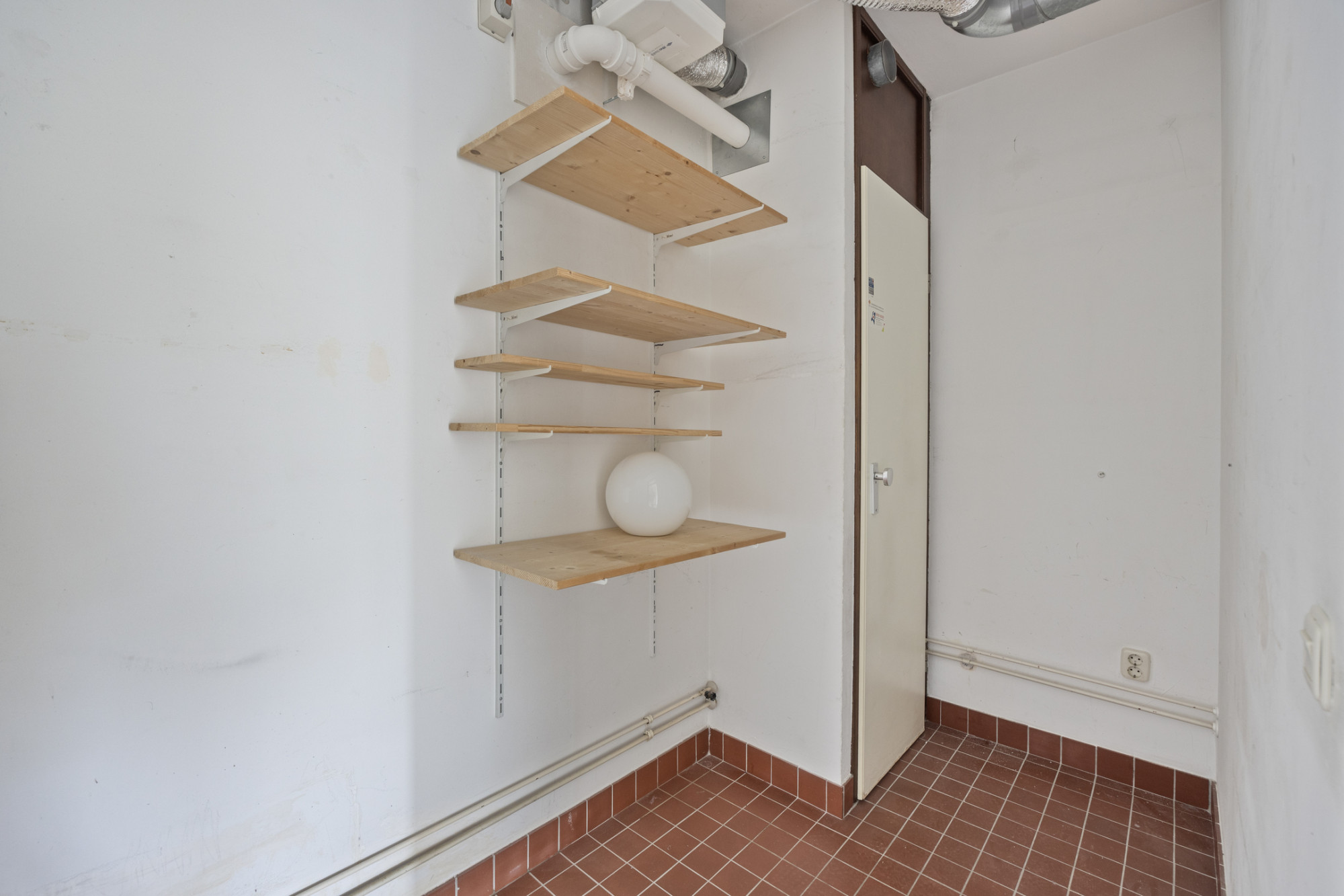 Bijkeuken/wasruimte/technische ruimte (2.80 x 1.40 m) met opstelling CV combi installatie (CR Remeha Tzerra, circa bouwjaar 2018), mechanische ventilatie box, wasmachine aansluiting en overige berging.