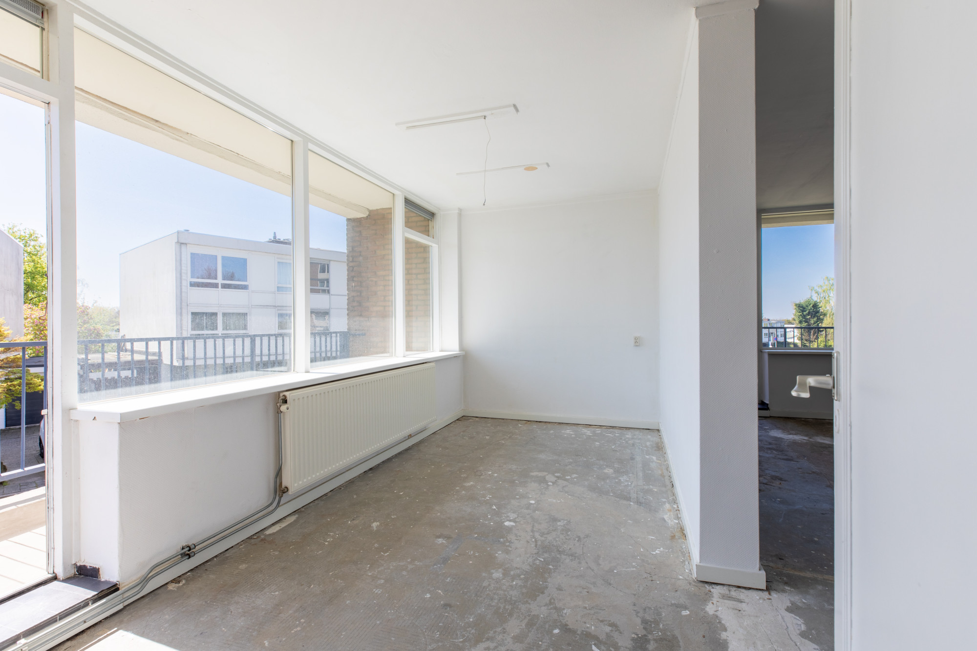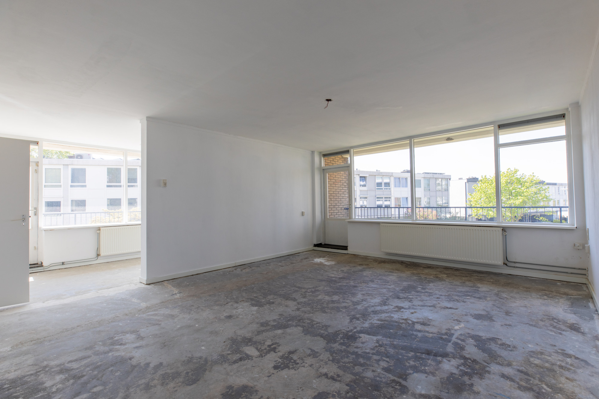 Ruime woonkamer met separate eetkamer beiden met toegang tot een balkon. Vanuit de eetkamer en hal toegang tot de keuken met eenvoudig keukenblok