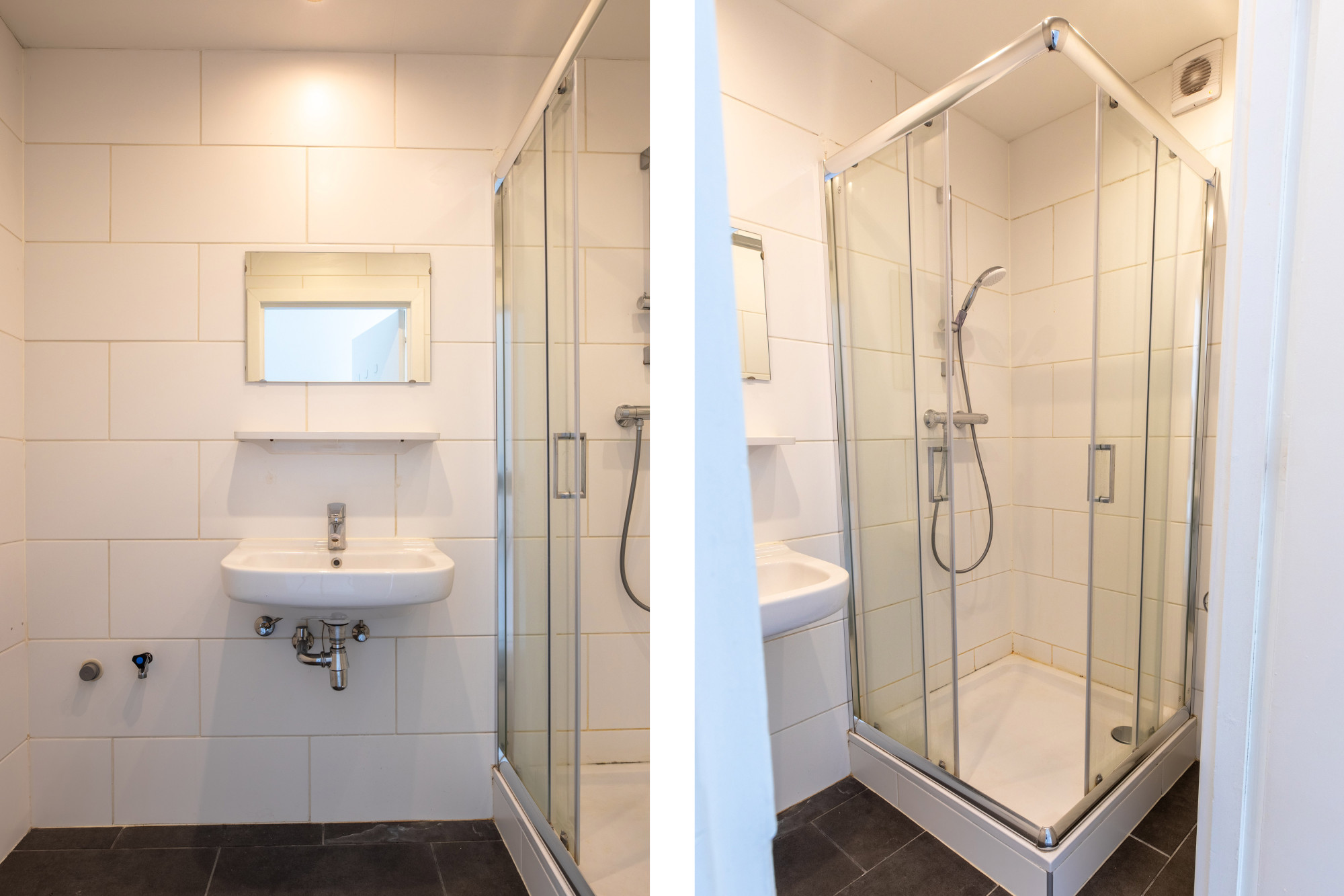 Geheel betegelde badkamer met douche en vaste wastafel., separaat toilet met closet en fonteintje.