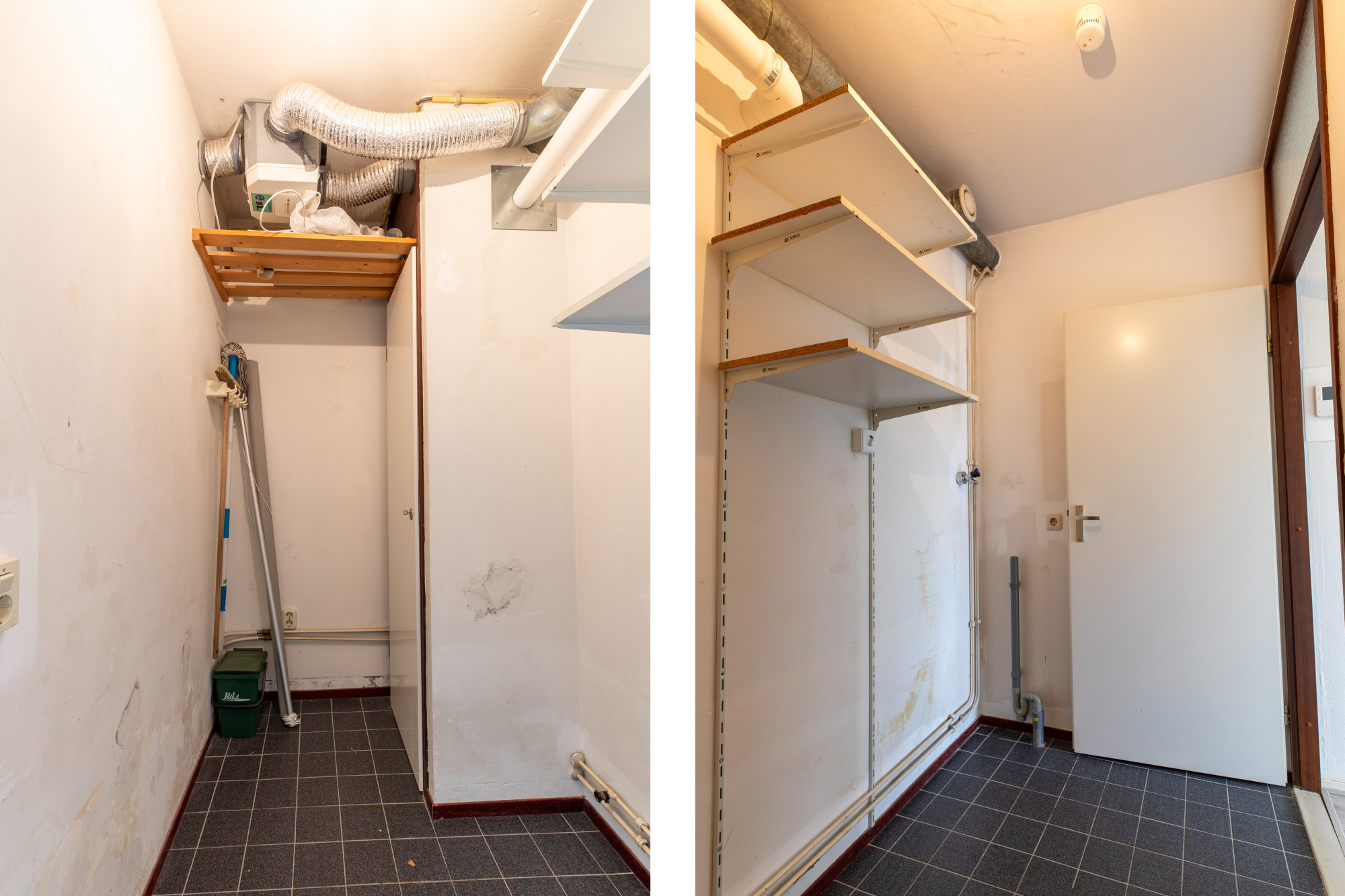 Bijkeuken/wasruimte/technische ruimte (2.80 x 1.40 m) met opstelling CV combi installatie (CR Remeha Tzerra, circa bouwjaar 2019), mechanische ventilatie box, wasmachine aansluiting en overige berging.