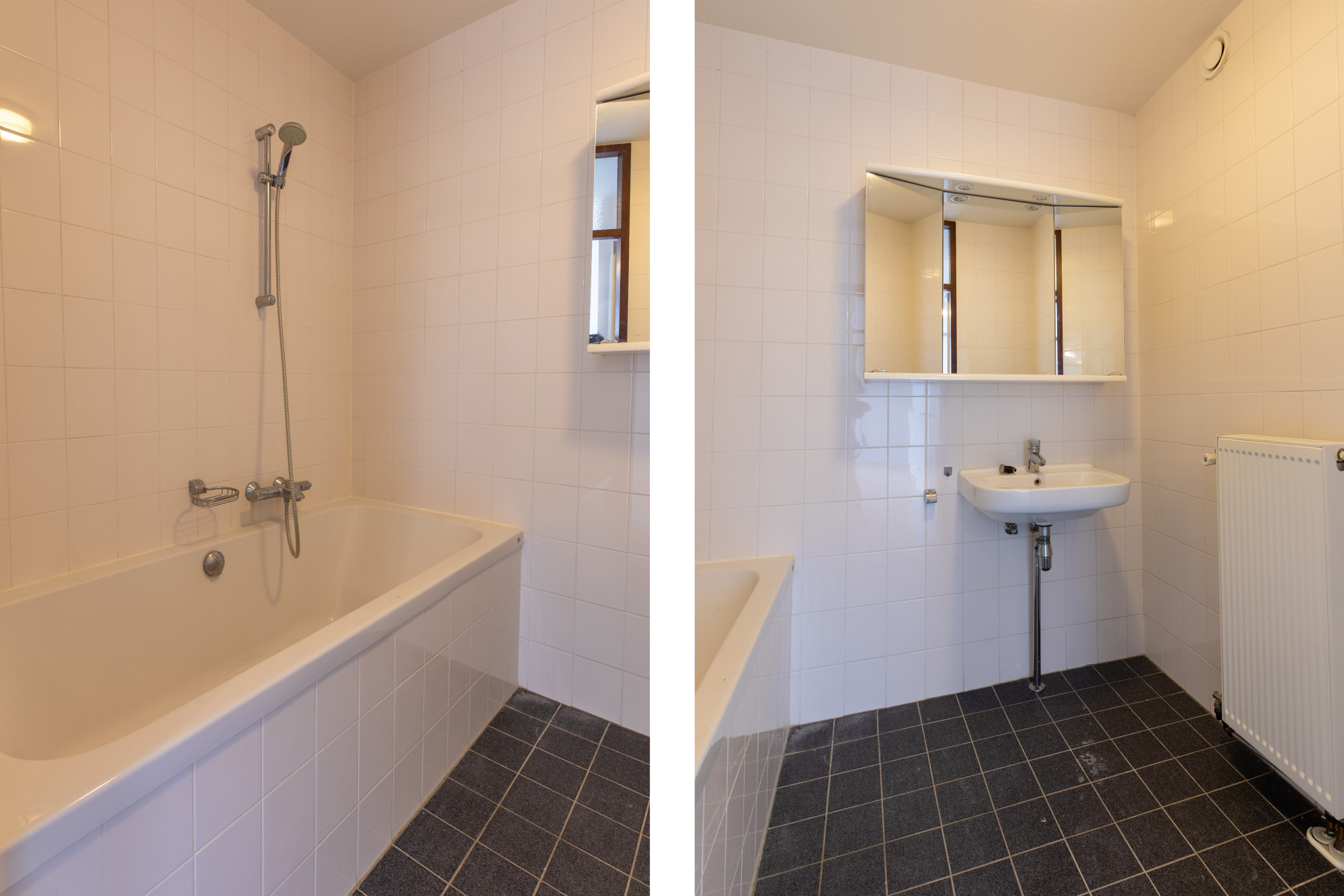 Geheel betegelde modern afgewerkte badkamer uit 2021 (2.26 x 1.80 m) met ruime inloopdouche, dubbele vaste wastafel en witgoed aansluiting.