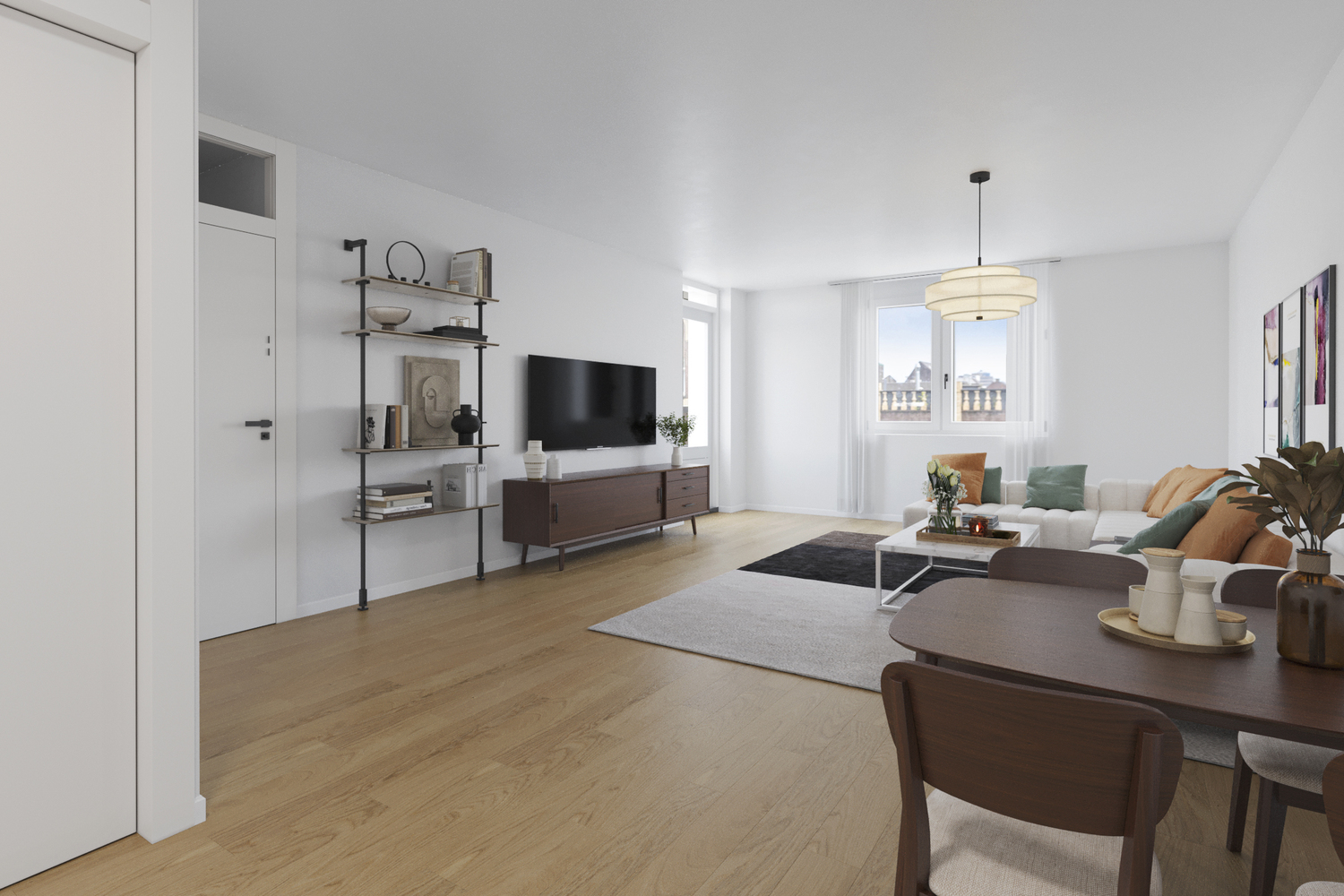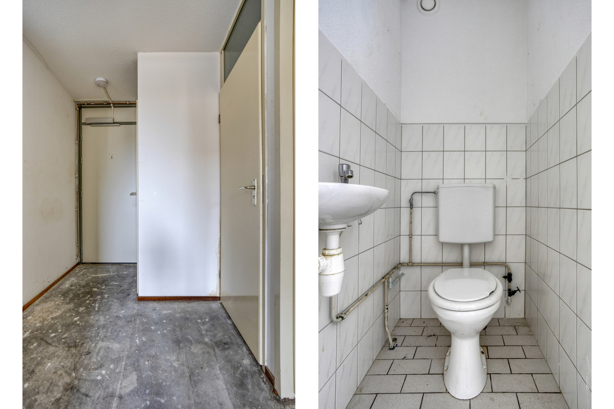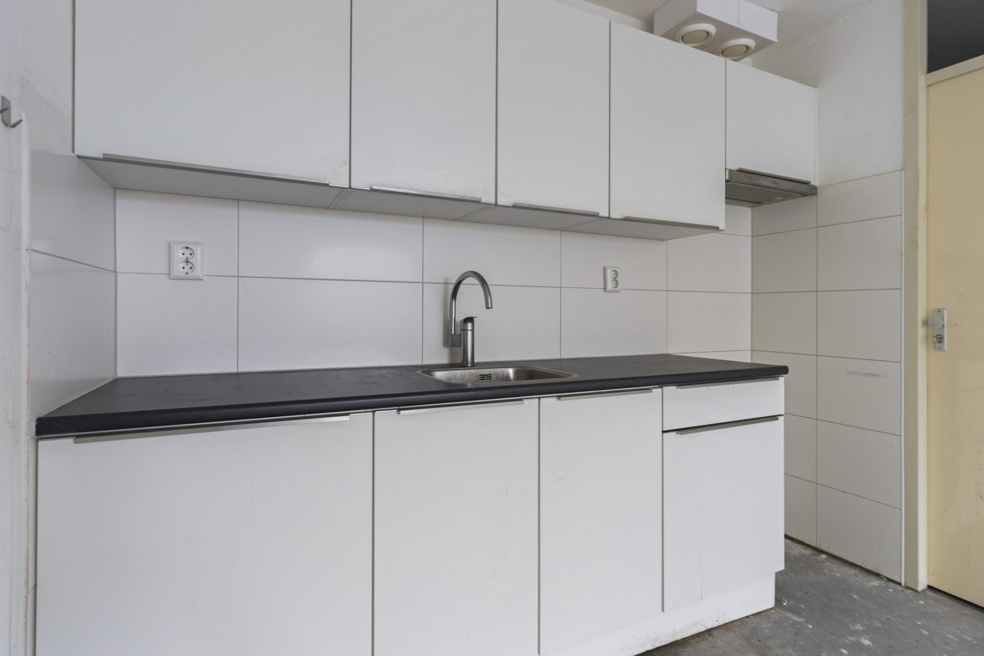 Entree, hal met toiletruimte. Lichte woonkamer met toegang tot het balkon; in open verbindingen met keukenhoek en keukenblok met diverse onder- en bovenkasten.