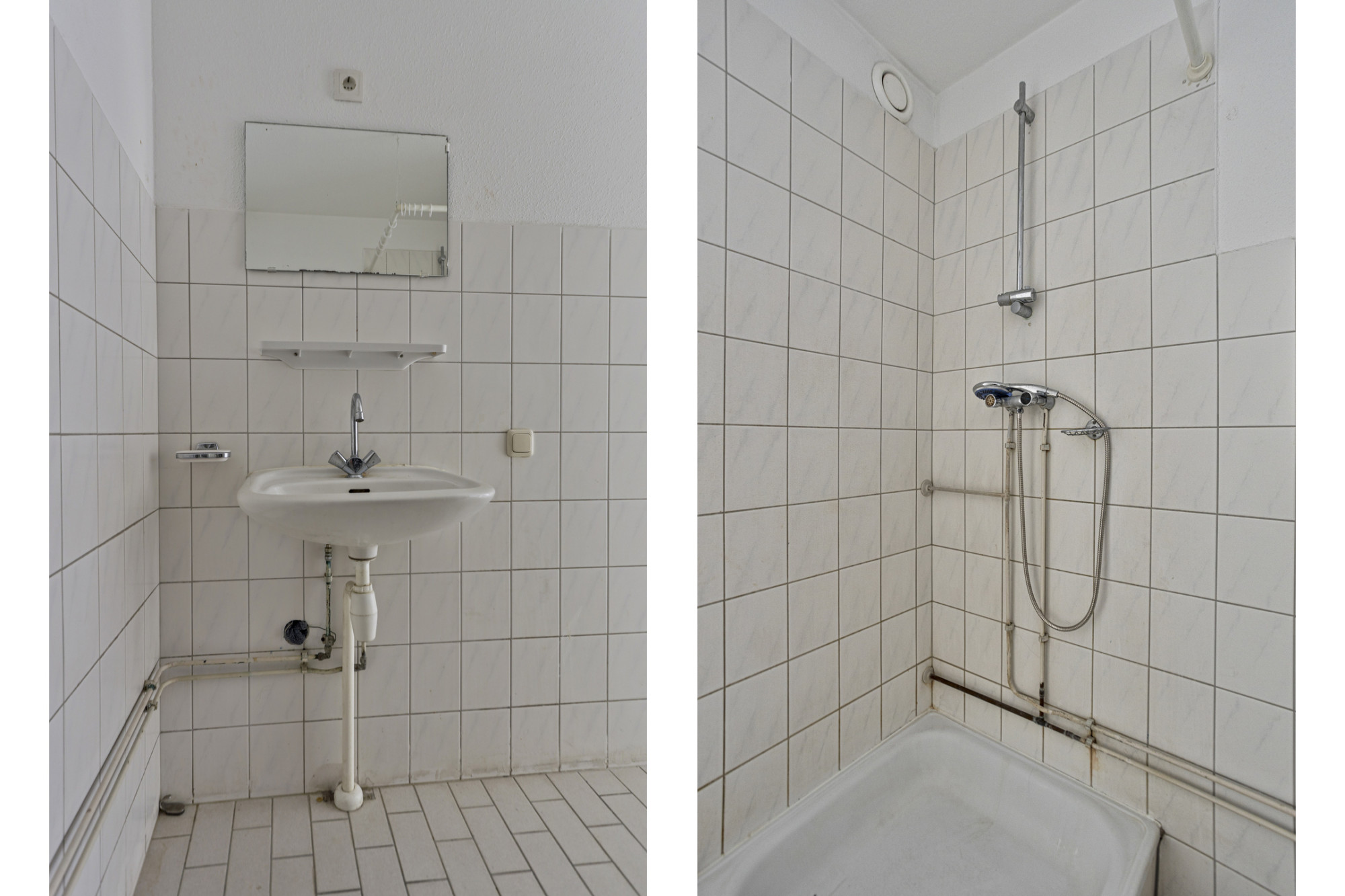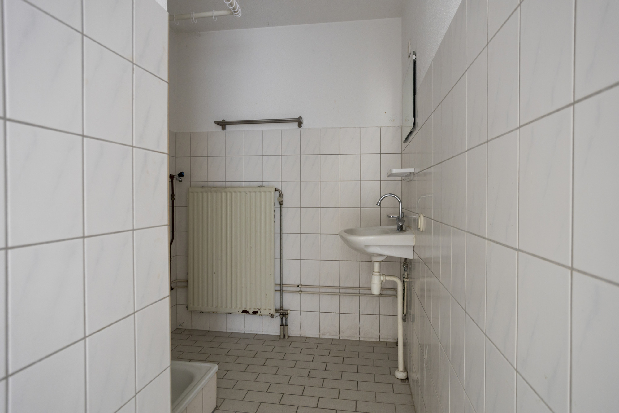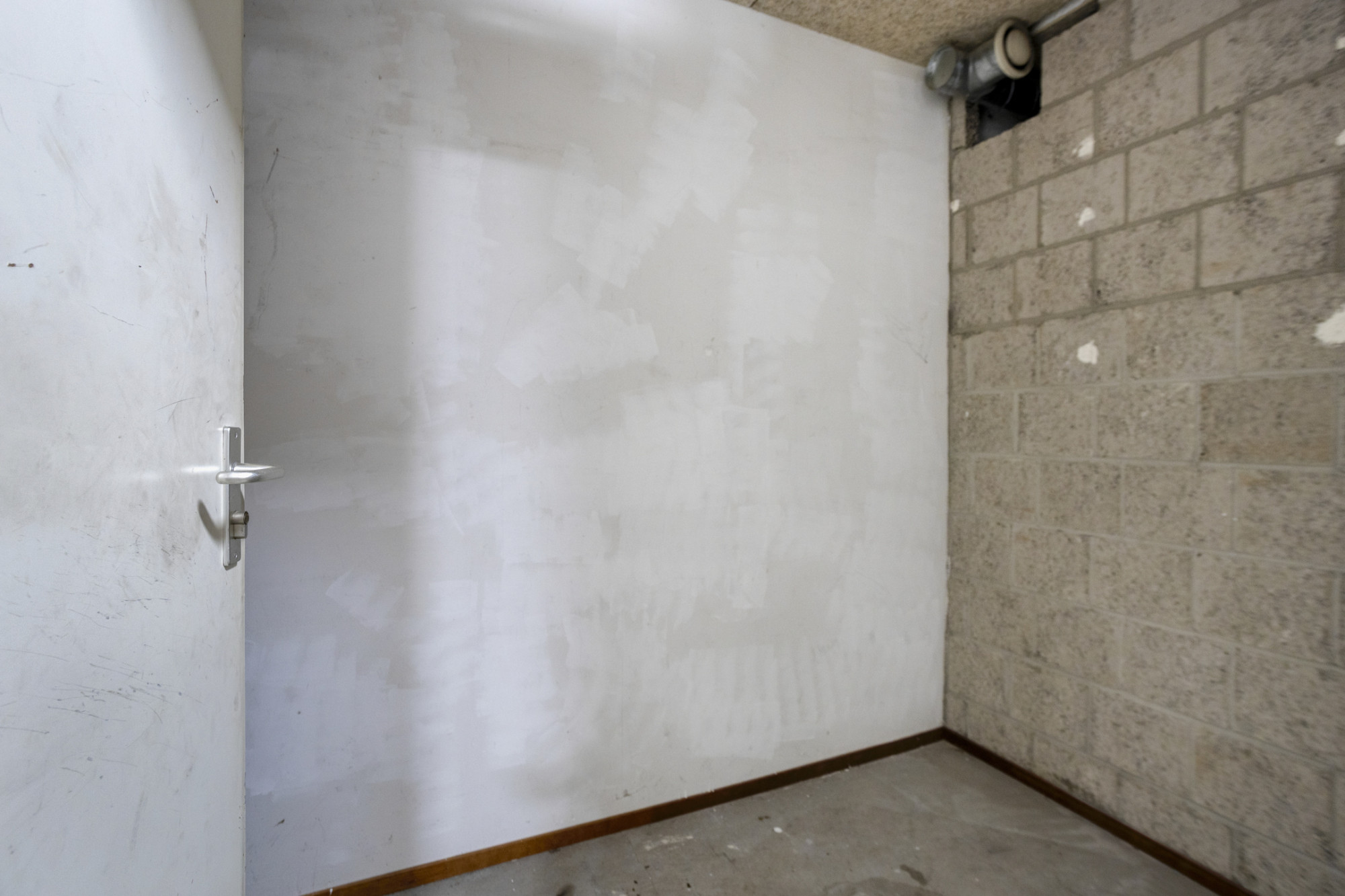 Badkamer met douche, vaste wastafel. Separate deels betegelde toiletruimte met duoblok en fonteintje. Techniekruimte