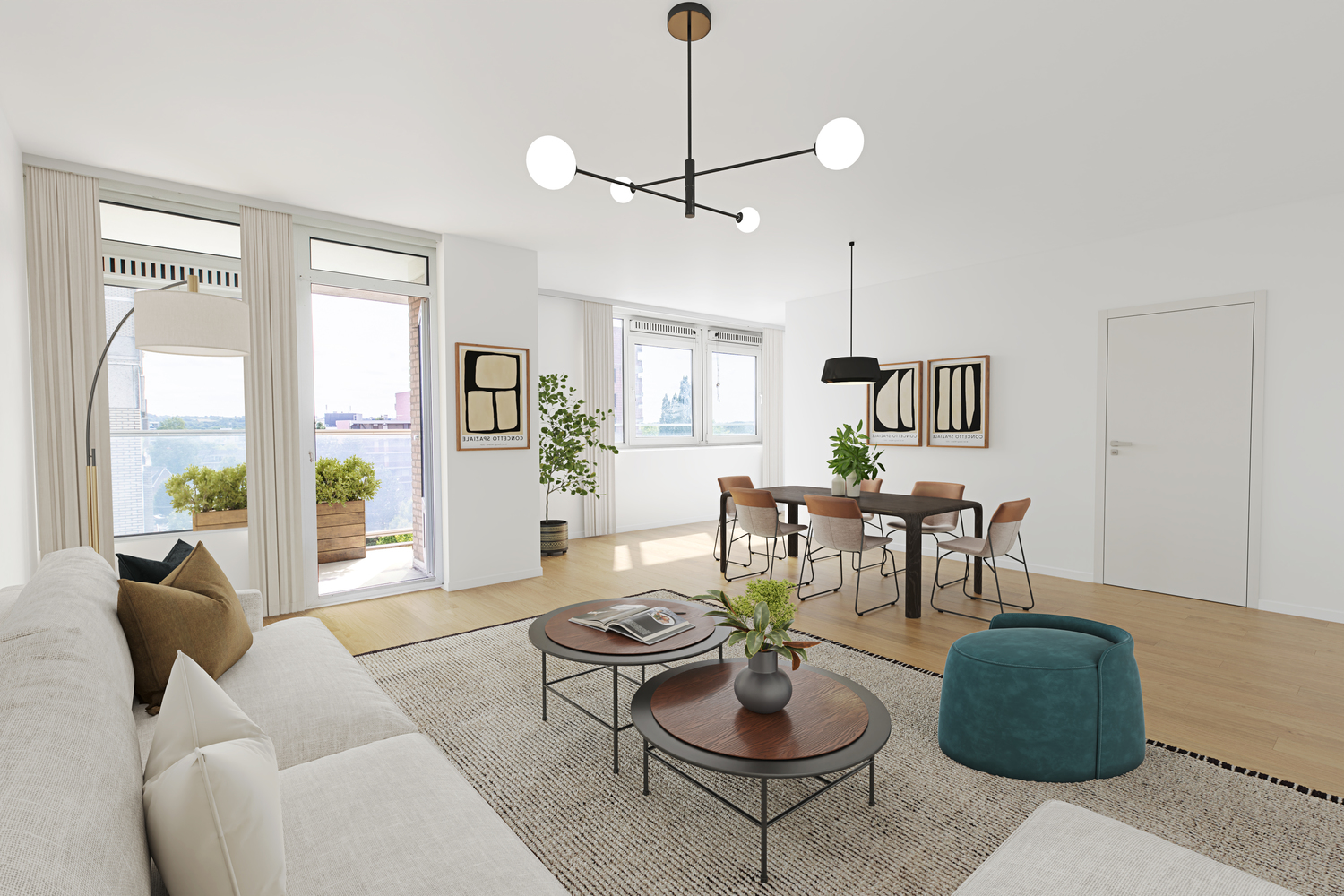 Woonkamer met toegang tot het balkon; half-open keuken met moderne keuken installatie in hoekopstelling met diverse onder- en bovenkasten en inbouwapparatuur.