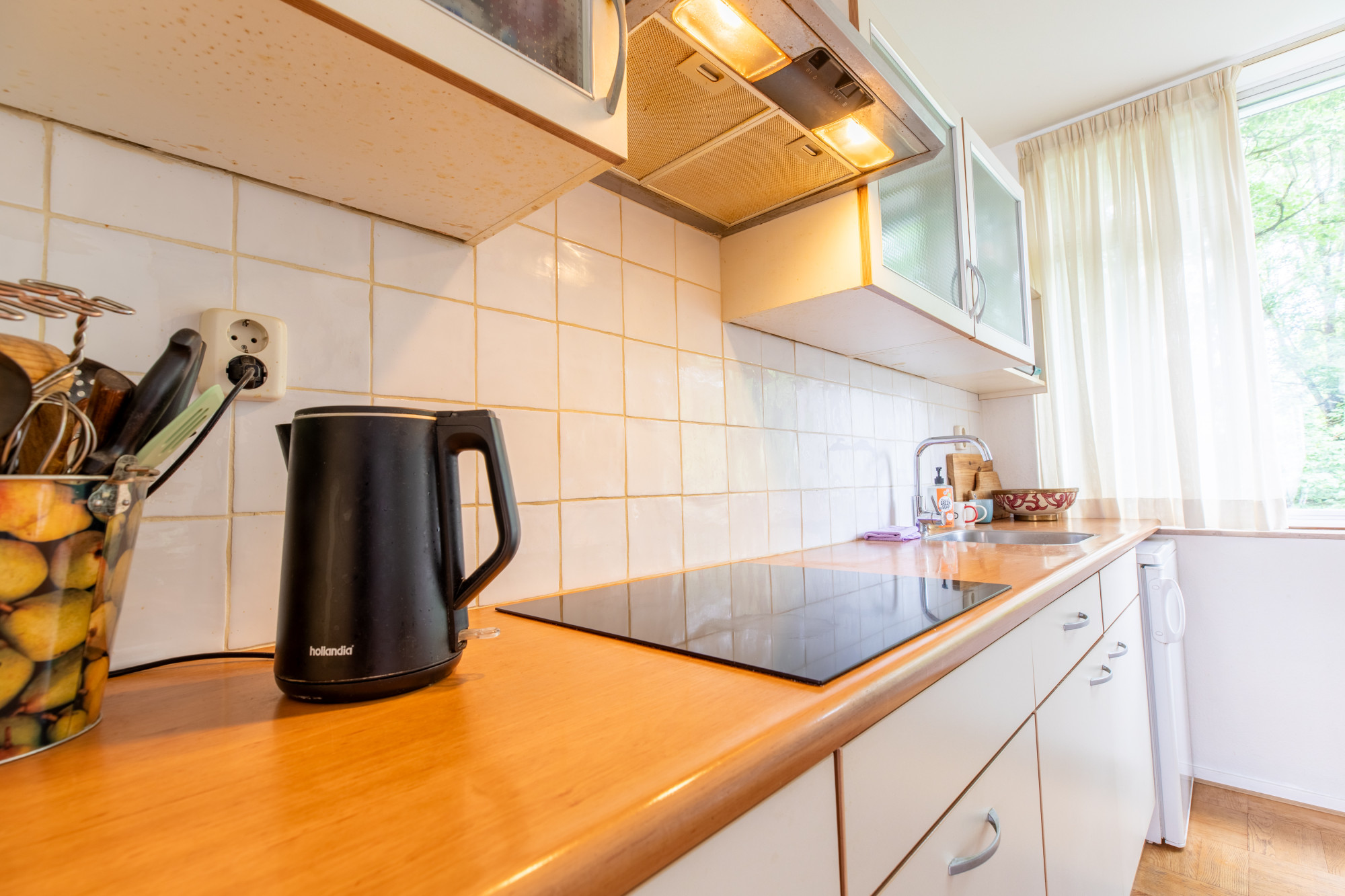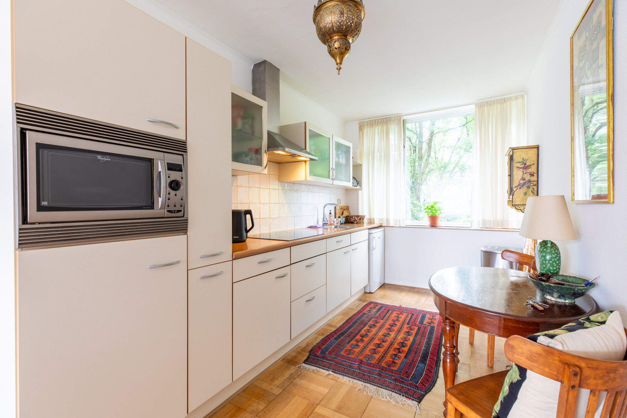 Ruime lichte woonkamer (5.04 x 4.98 m) met vrij zicht en toegang tot het ruime balkon. Vanuit woonkamer open verbinding naar keuken (5.10 x 2.26 m) met keukeninstallatie met diverse onder- en bovenkasten, apothekerskast, inbouwapparatuur te weten: 4 -pits inductie kookplaat, afzuigkap, combi- magnetron en vrijstaande koelkast.