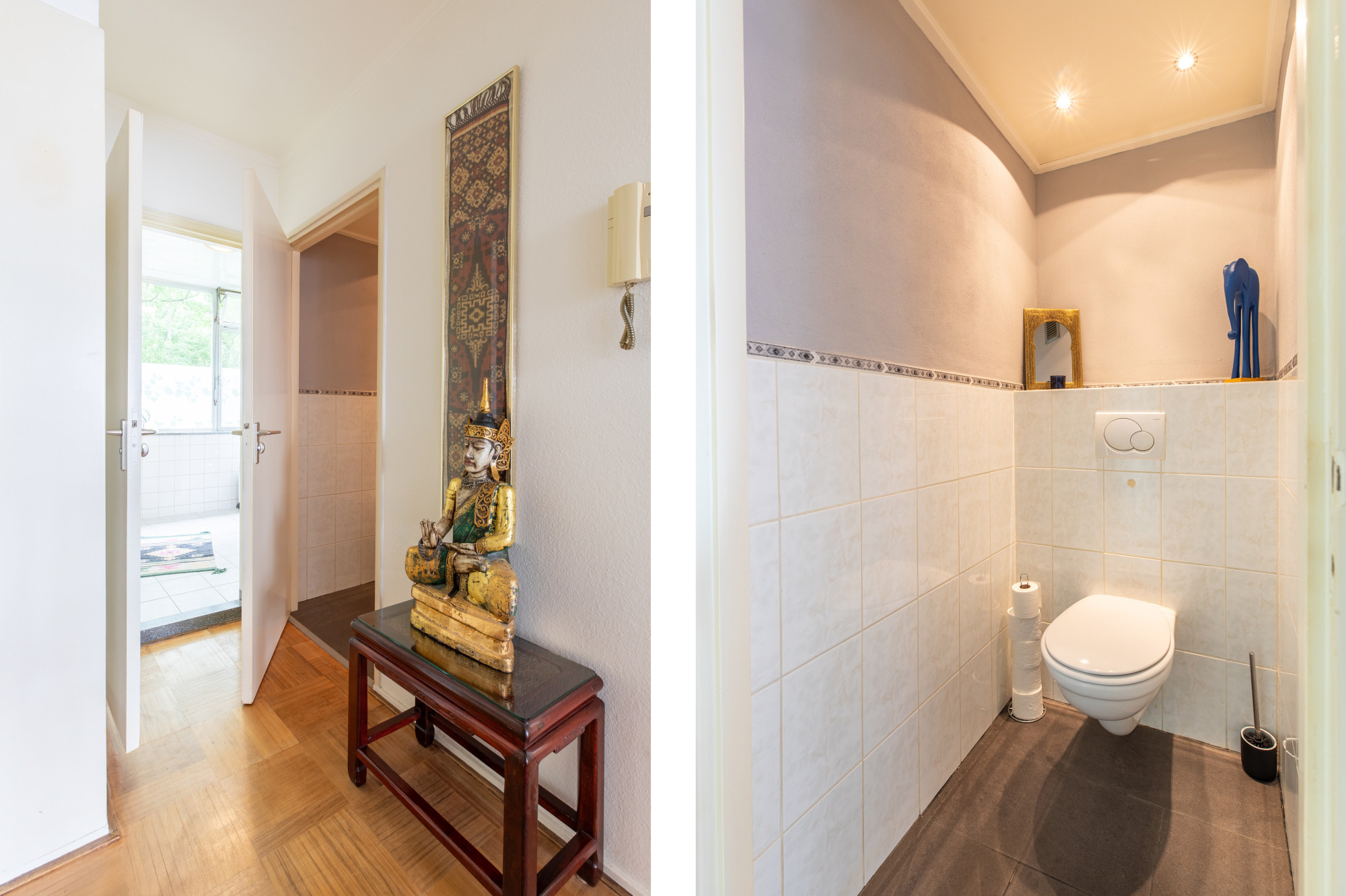 Hal met toegang tot alle vertrekken voorzien van doorlopende parketvloer met muurkast en deels betegelde toiletruimte met wandcloset.