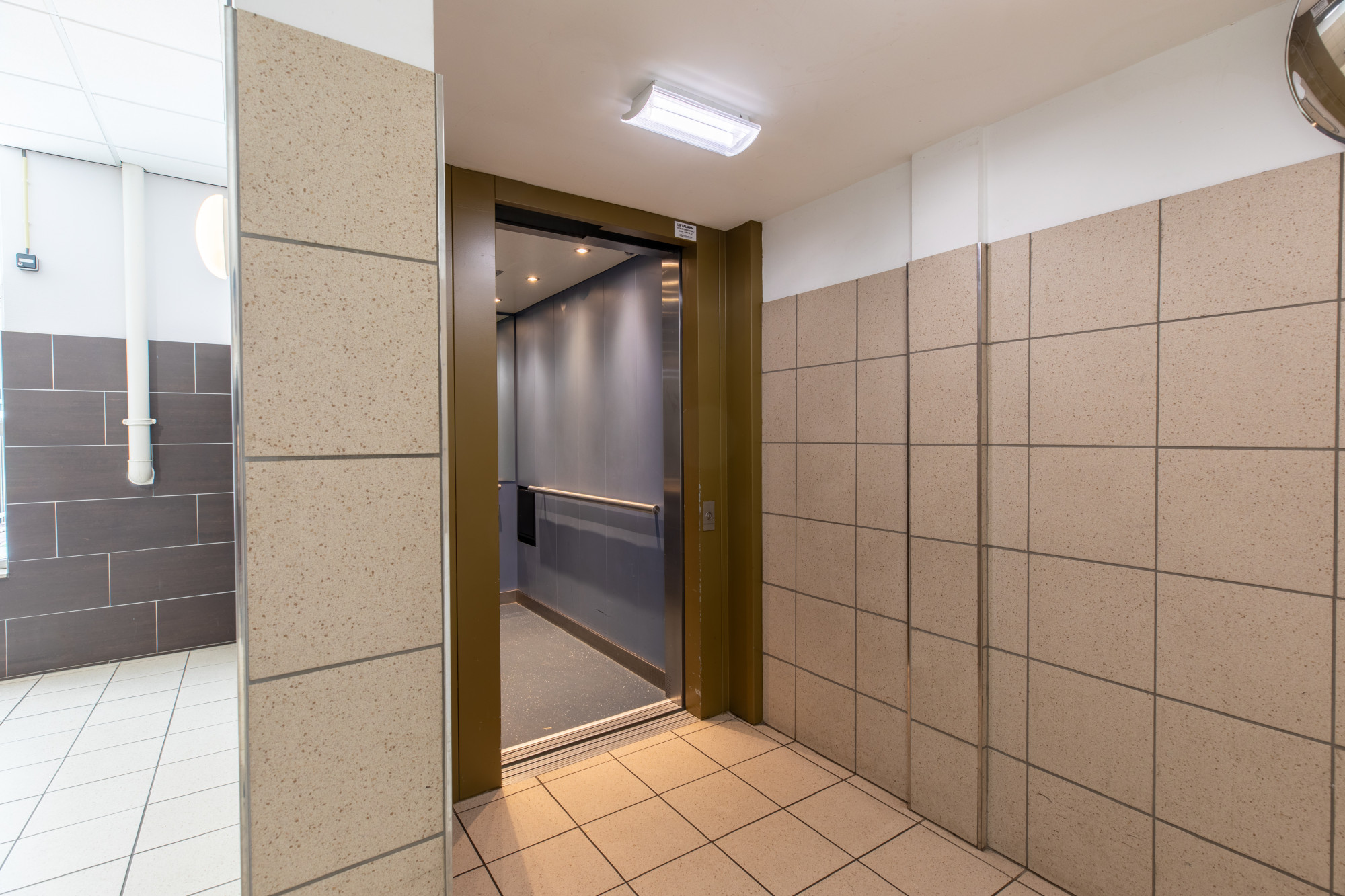 Centrale entree met brievenbussen, bellen plateau en lift installatie.