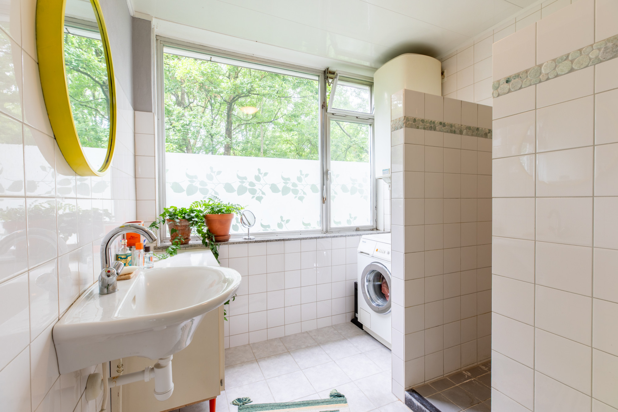 Badkamer (2.49 x 2.27 m) met inloopdouche, vaste wastafel en witgoed aansluiting.