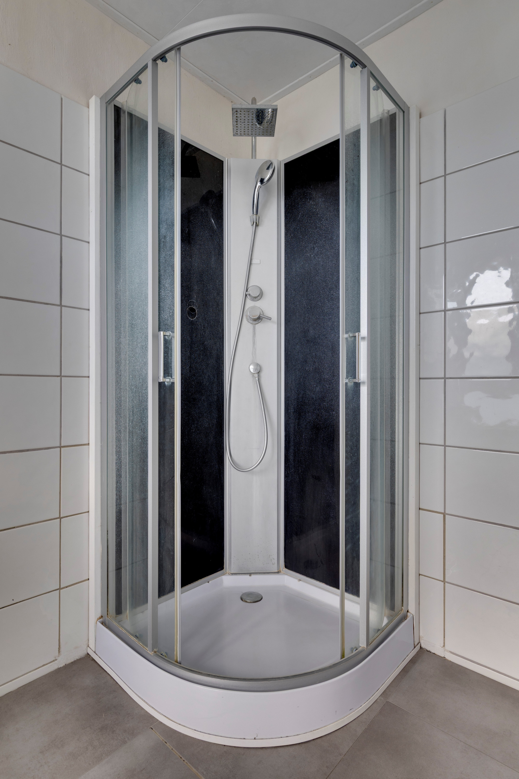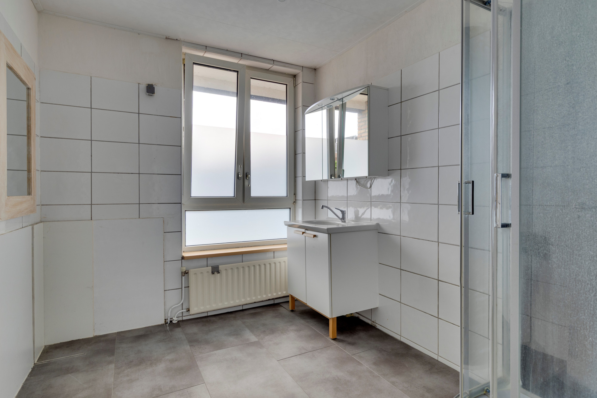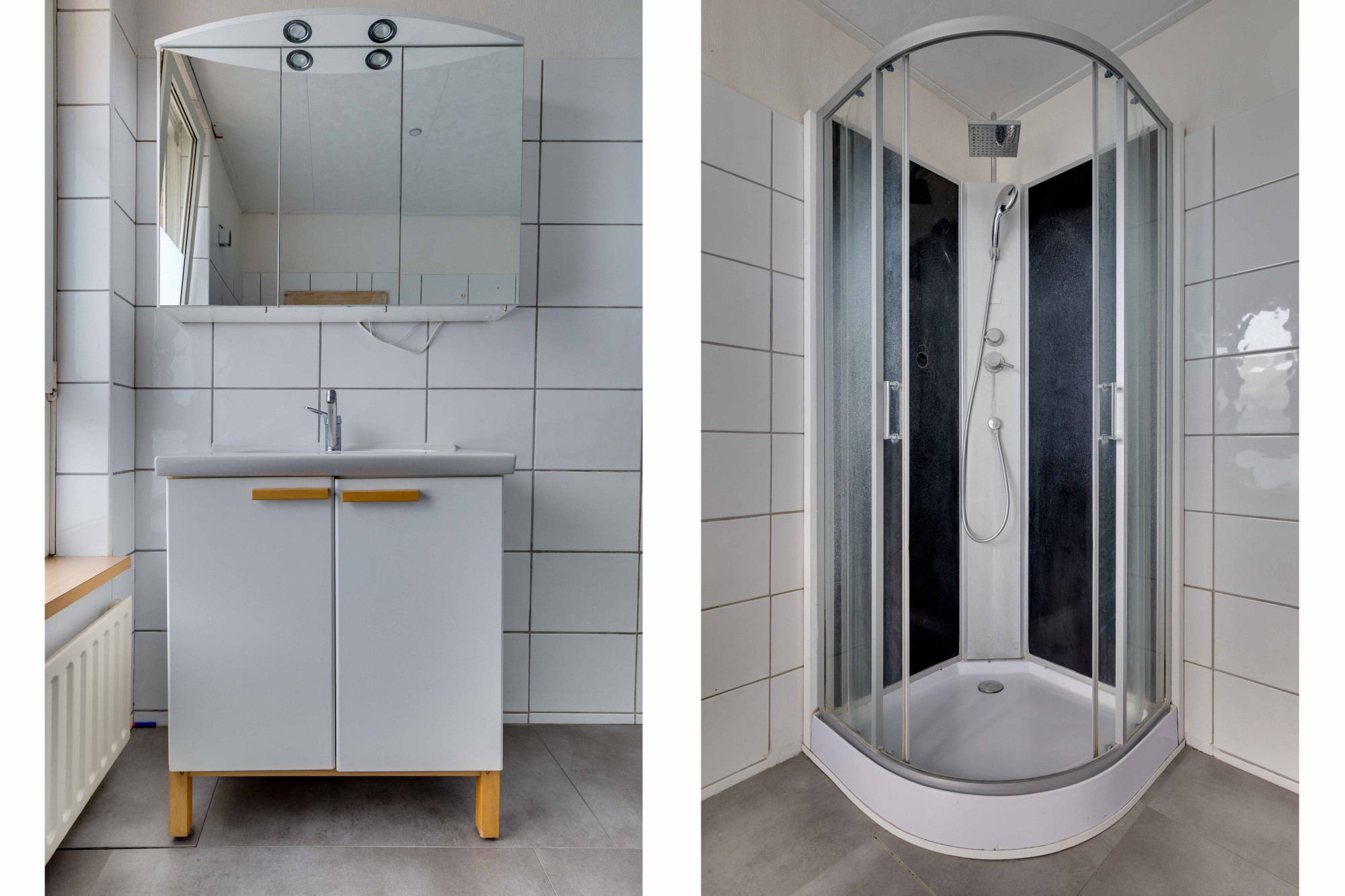 Betegelde eenvoudige badkamer v.v. douche cabine, wastafelmeubel en aansluitpunt voor wasmachine.