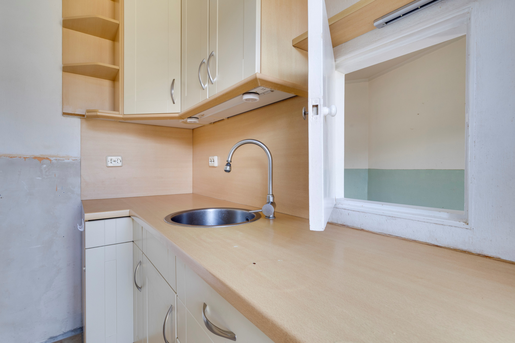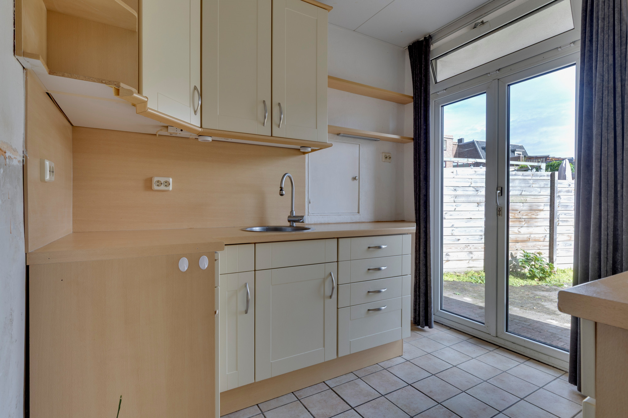 Gesloten keuken v.v. aanbouwinstallatie incl. inbouwapparatuur, te weten, Koel/vriescombinatie, wasemkap, elektrische kookplaat. Via de keuken heeft men eveneens via een dubbele deur toegang naar de achtergelegen betegelde tuin.