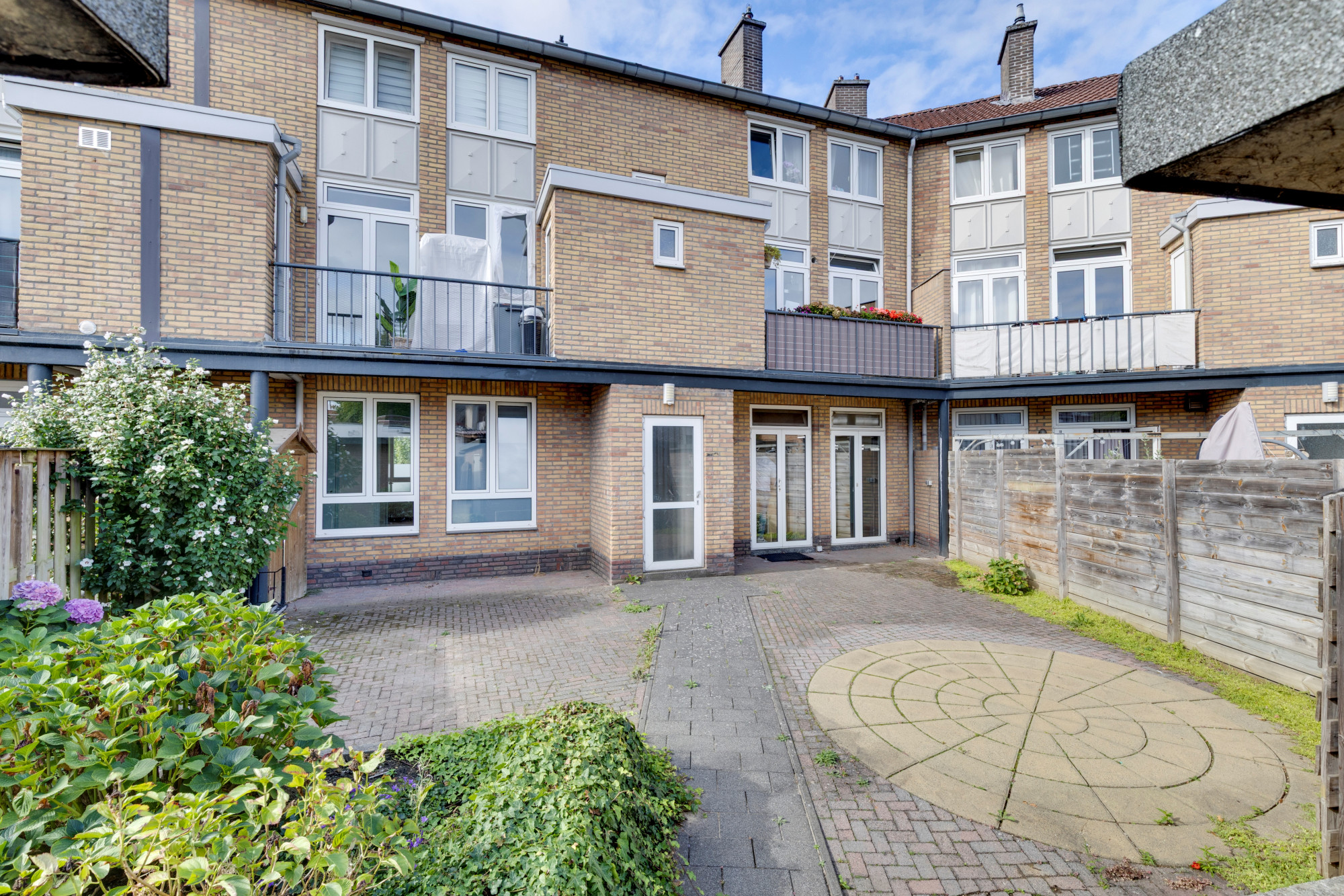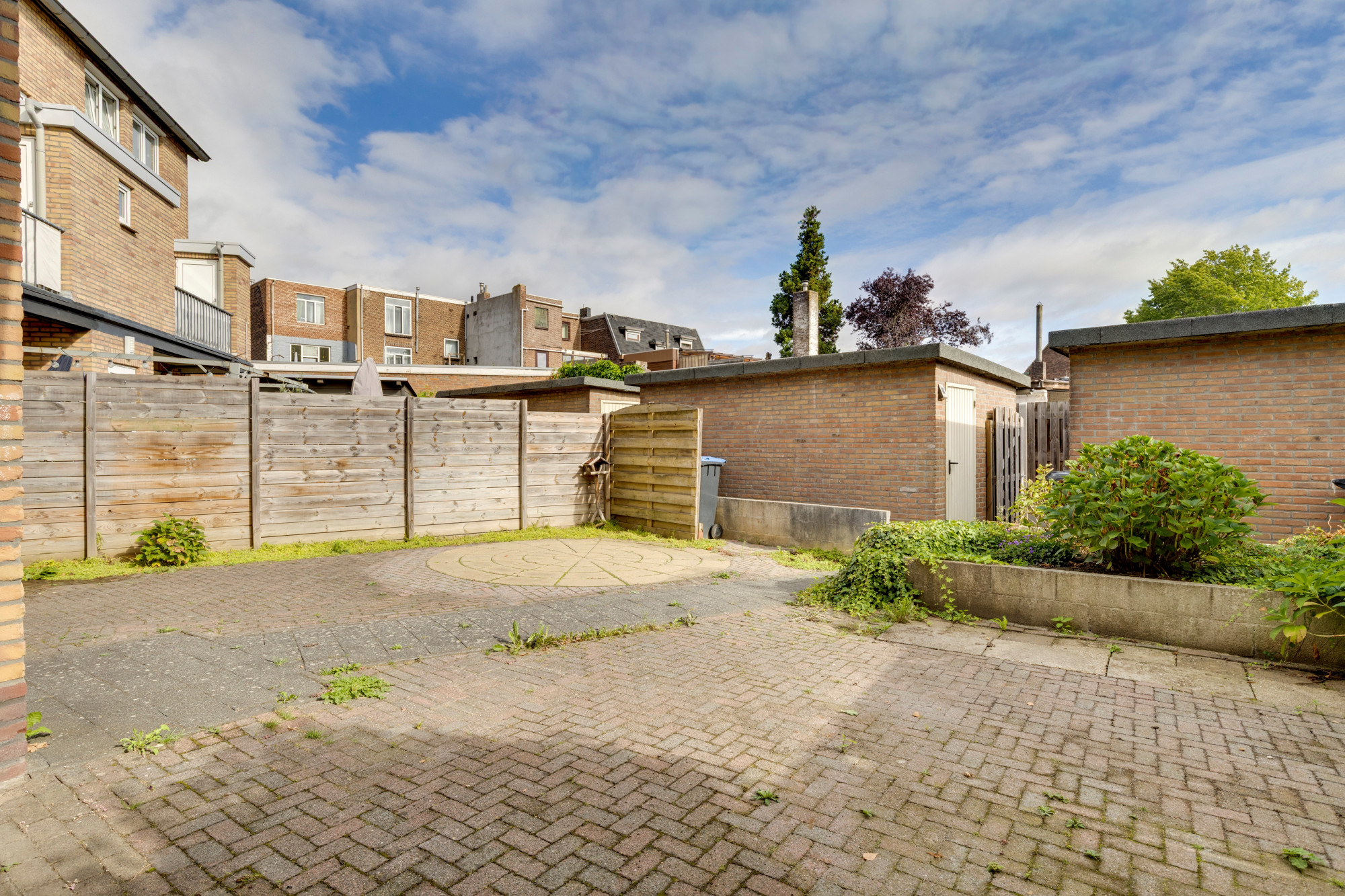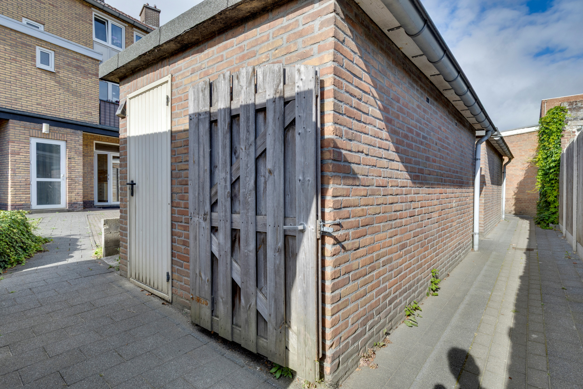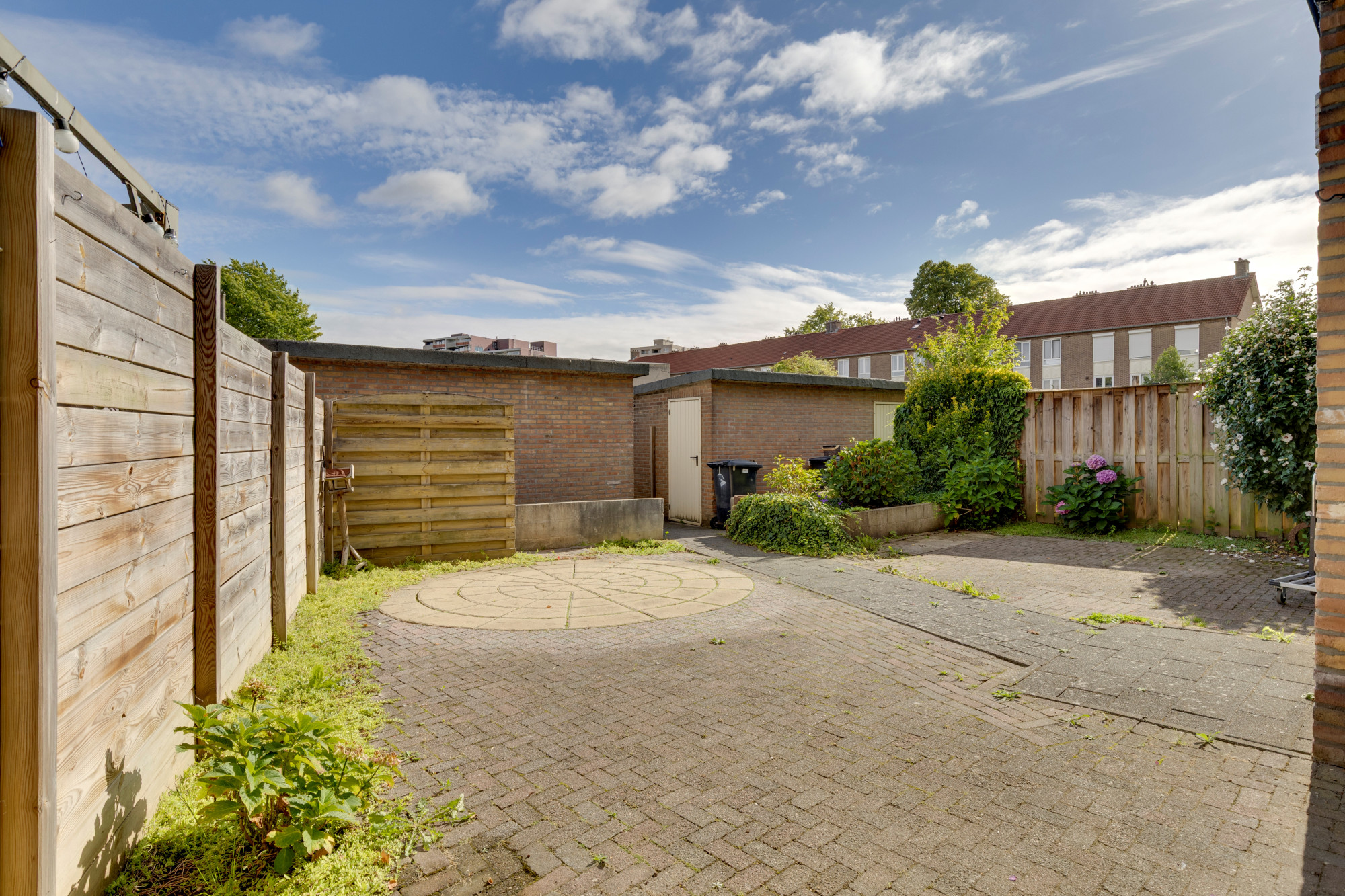 Betegelde tuin aan de achterzijde en stenen berging. De tuin is achterom bereikbaar.