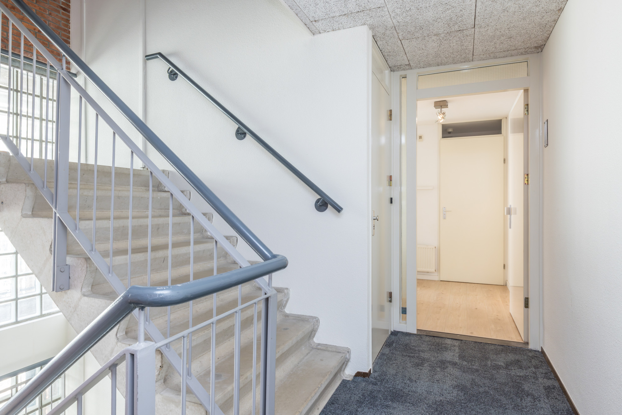 Gezamenlijke entree met bellentableau, trappartij en brievenbussen.