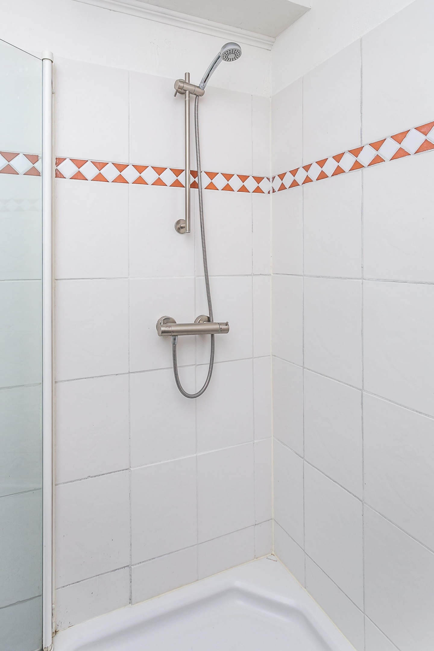 Tevens toegang tot de betegelde badkamer voorzien van een inloopdouche en wastafel. Naast gelegen kom je in de slaapkamer terecht.