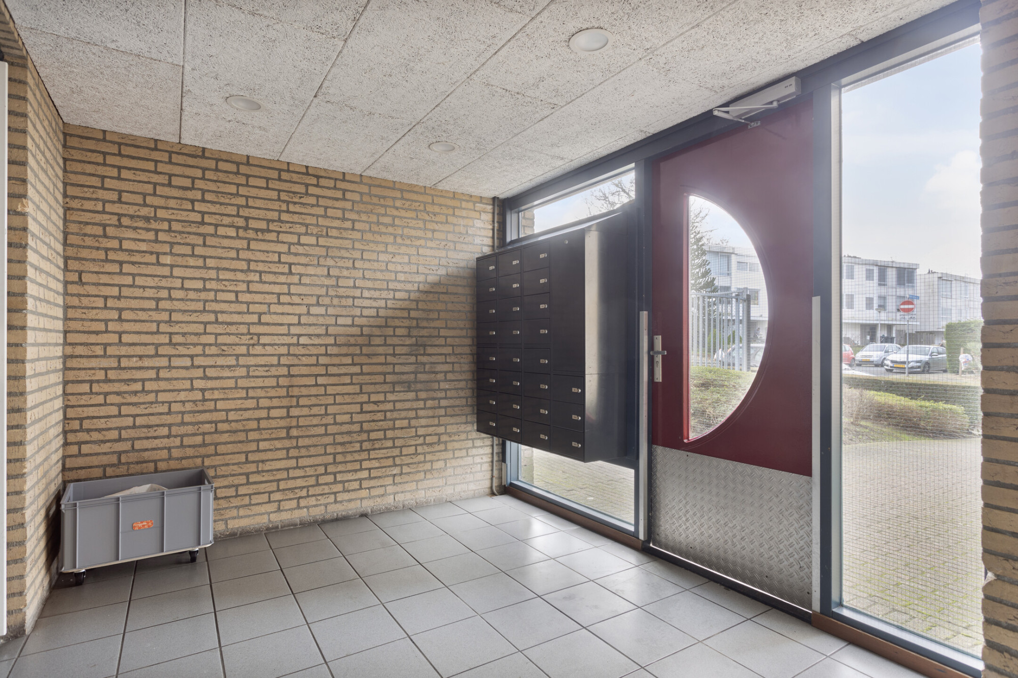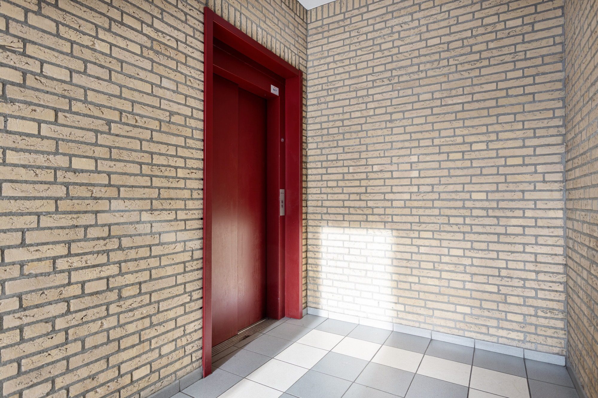 Central entree met brievenbussen, bellentableau en liftinstallatie.