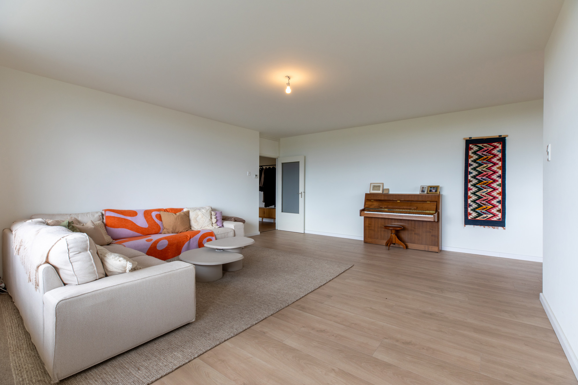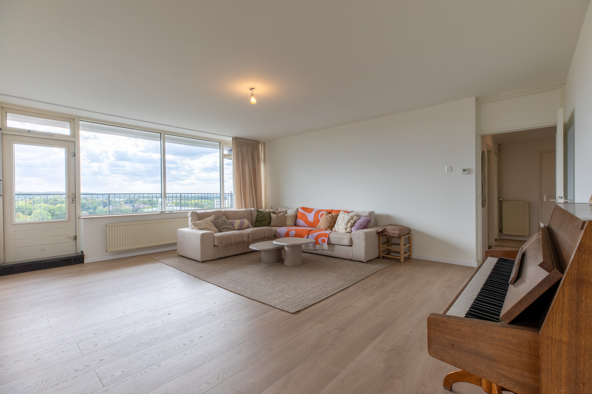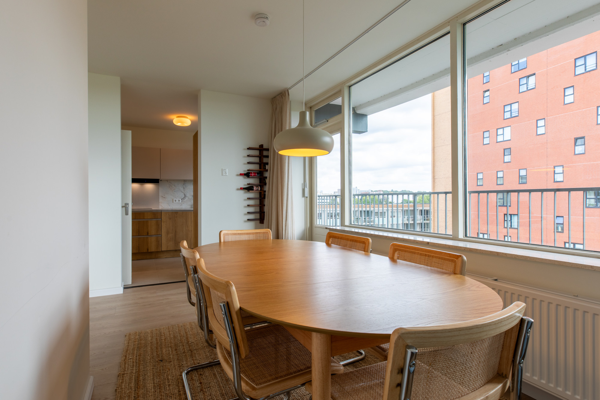 Ruime woonkamer (5.85 X 4.96 m) met panoramisch zicht en met toegang tot zuid/west balkon (10.23 x 1.14 m). Separate eetkamer (4.95 x 2.29 m) met toegang tot de half/open keuken (3.15 x 2.39 m) met luxe keuken installatie met diverse onder- en bovenkasten, inbouwapparatuur te weten: flexzone inductie kookplaat, afzuigkap, combi-magnetron, vaatwasser, koelkast en separate vrieskast; vanuit de eetkamer en keuken toegang tot het zuid/oost balkon (7.56 x 1.10 m).