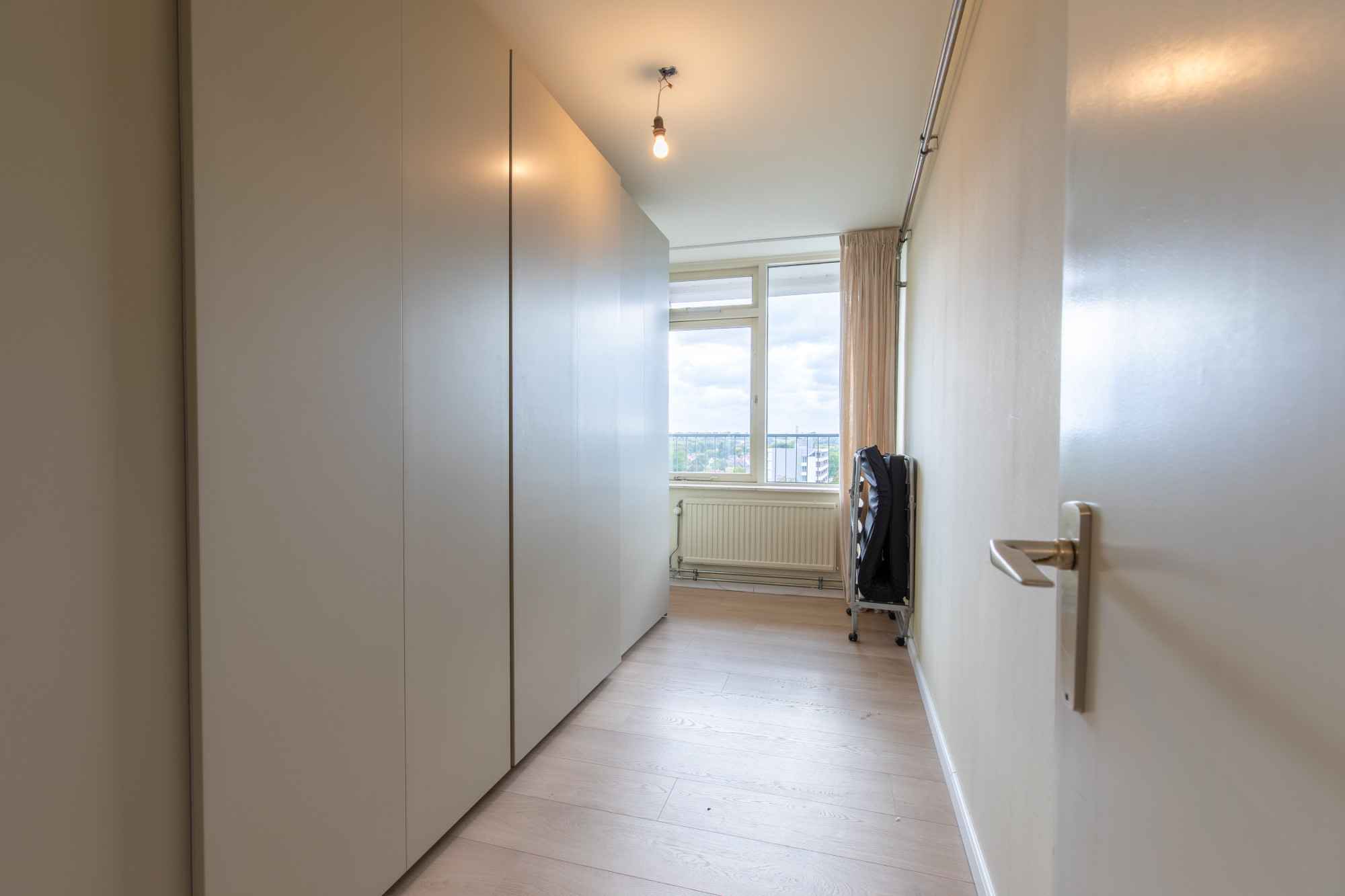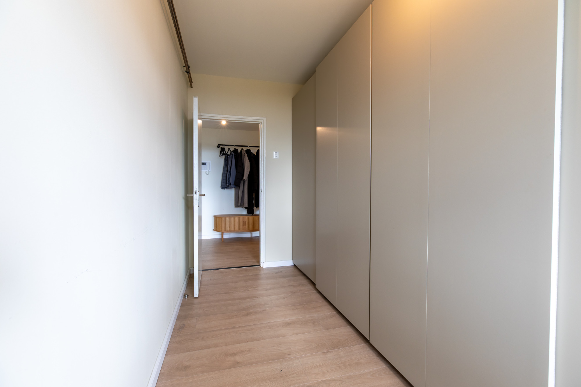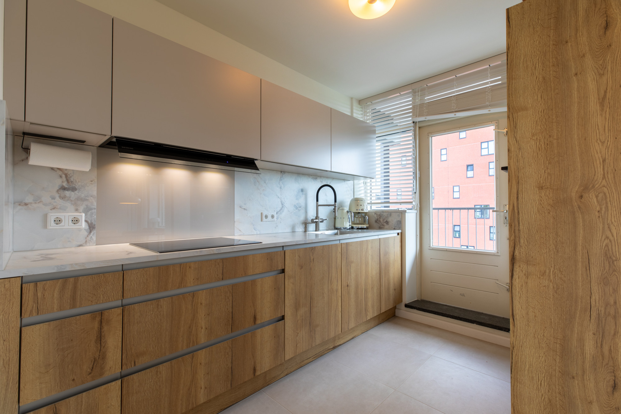 Ruime woonkamer (5.85 X 4.96 m) met panoramisch zicht en met toegang tot zuid/west balkon (10.23 x 1.14 m). Separate eetkamer (4.95 x 2.29 m) met toegang tot de half/open keuken (3.15 x 2.39 m) met luxe keuken installatie met diverse onder- en bovenkasten, inbouwapparatuur te weten: flexzone inductie kookplaat, afzuigkap, combi-magnetron, vaatwasser, koelkast en separate vrieskast; vanuit de eetkamer en keuken toegang tot het zuid/oost balkon (7.56 x 1.10 m).