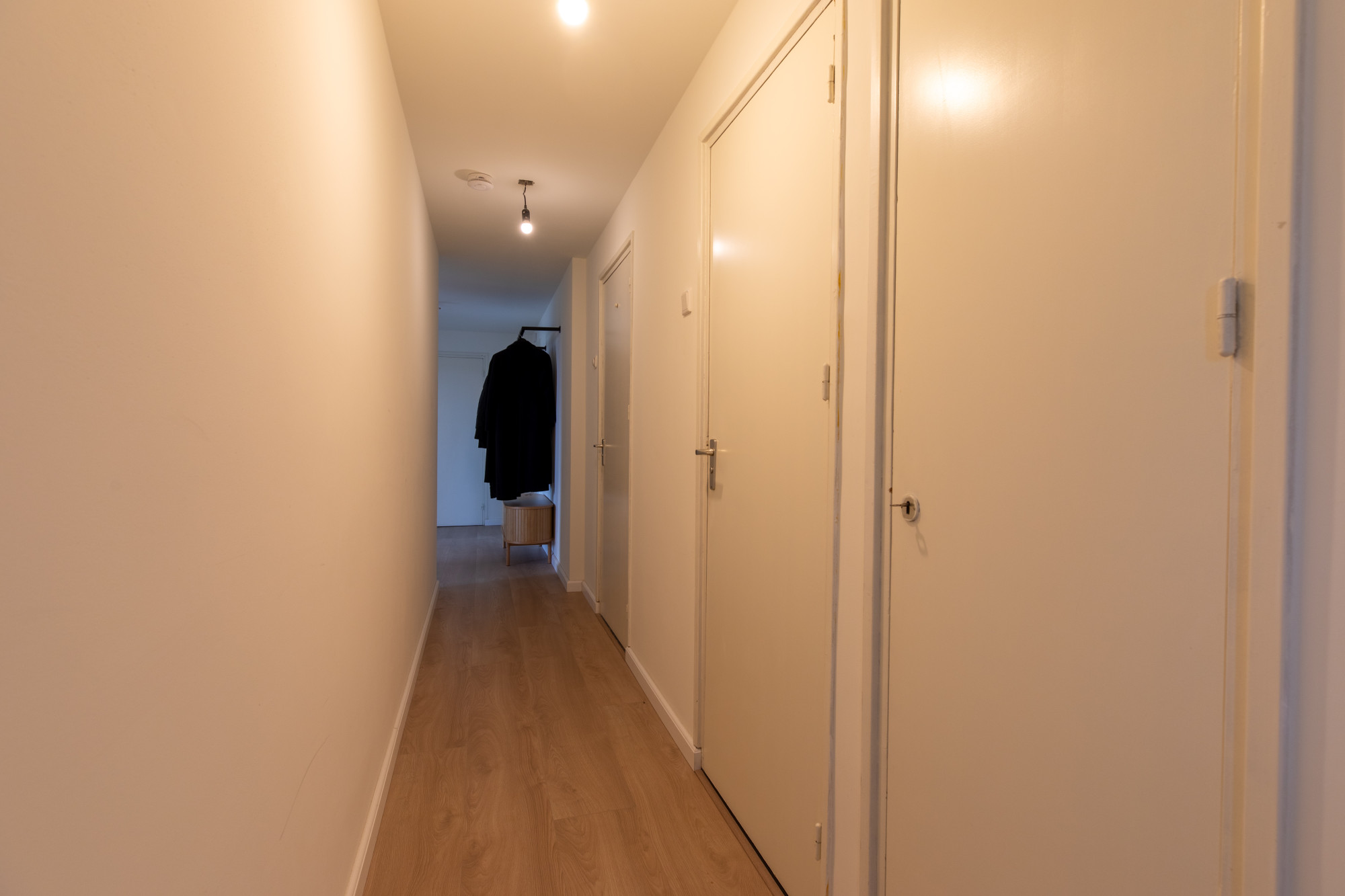 Verdeelhal met toegang tot de appartementen. Entree met ruime hal met doorlopende laminaat vloer.