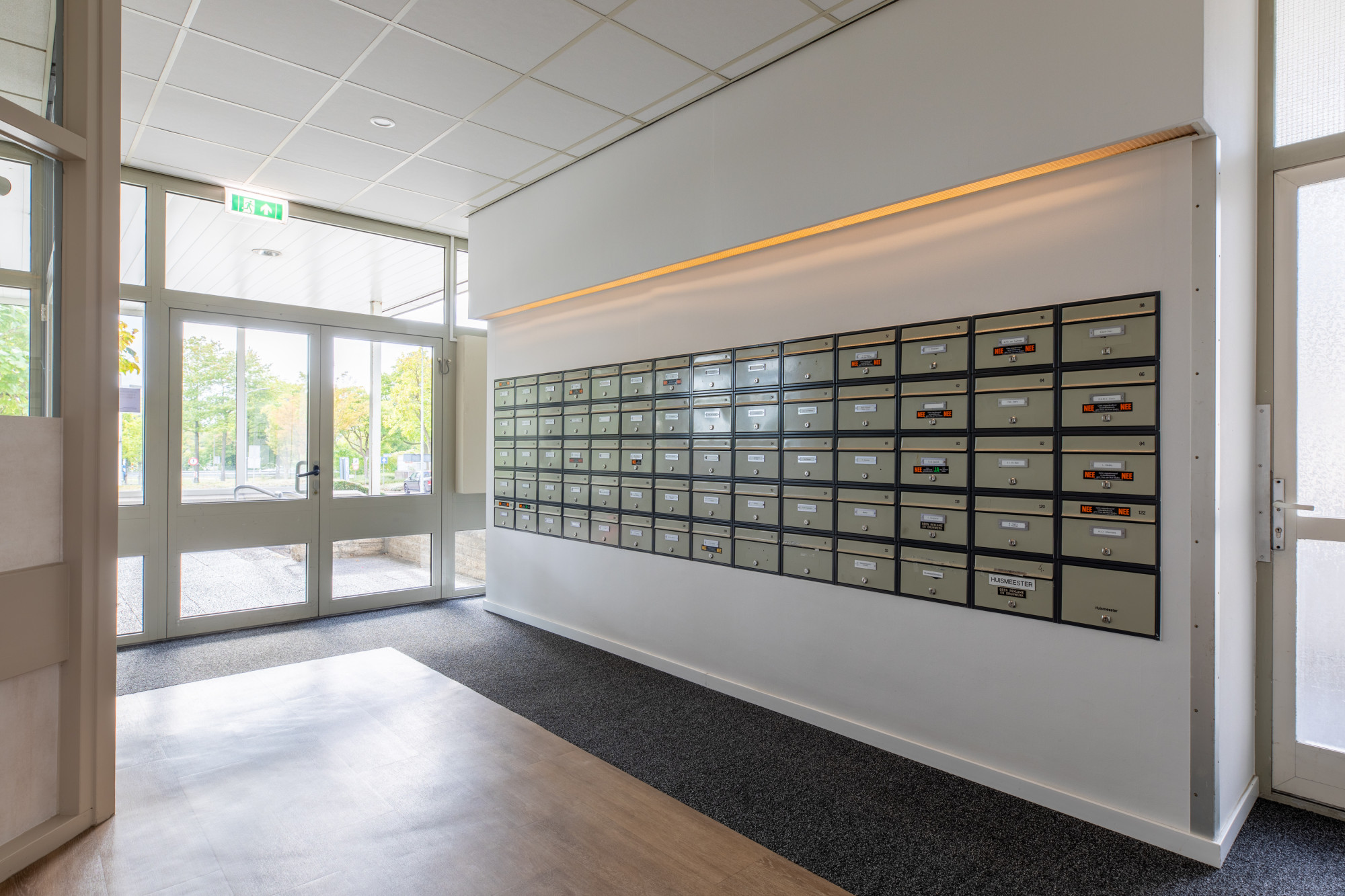 Centrale ingang met bellen plateau, brievenbussen en liftinstallatie.