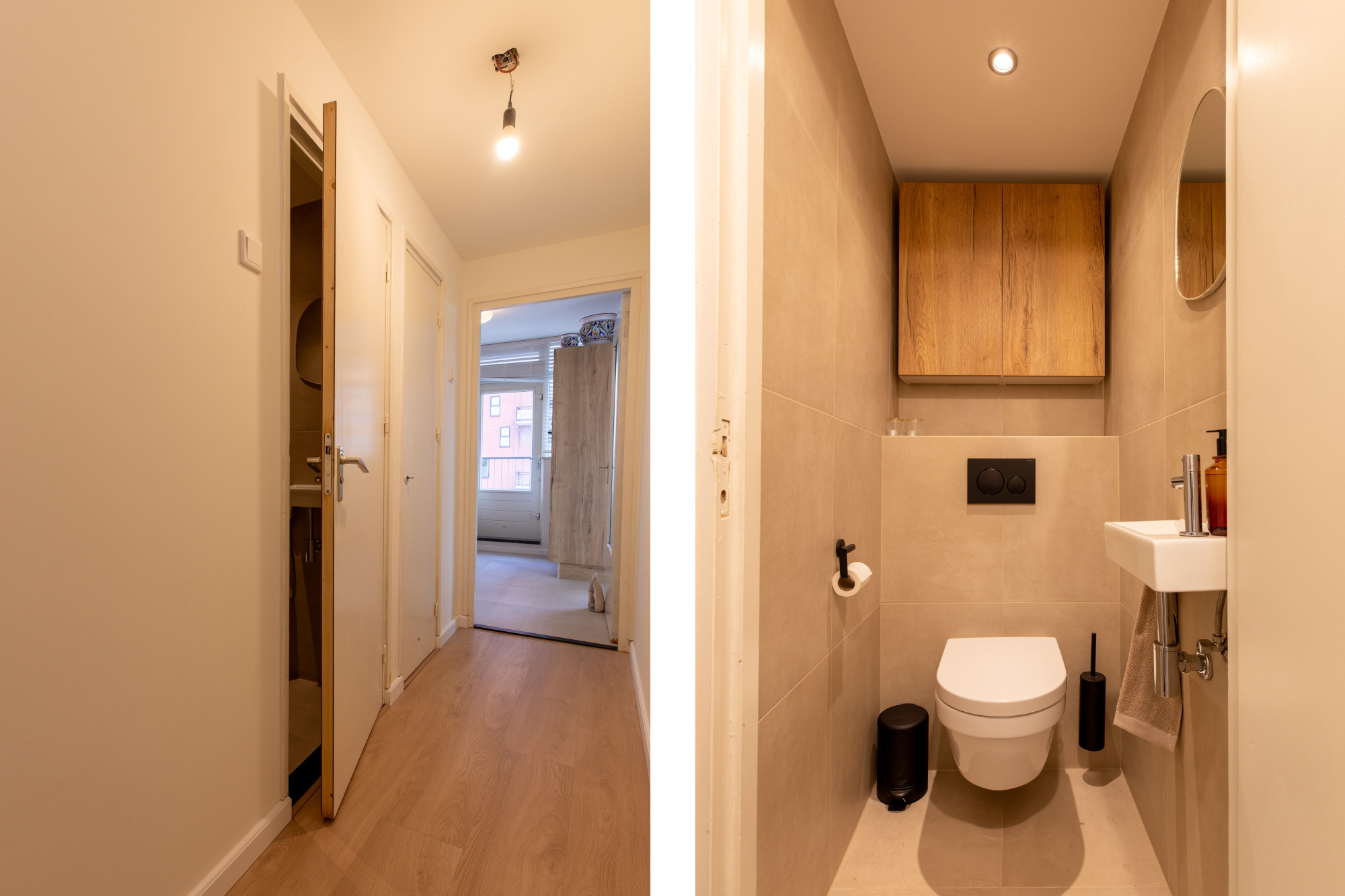 Separaat toilet met wandcloset, opbergkast en fonteintje.