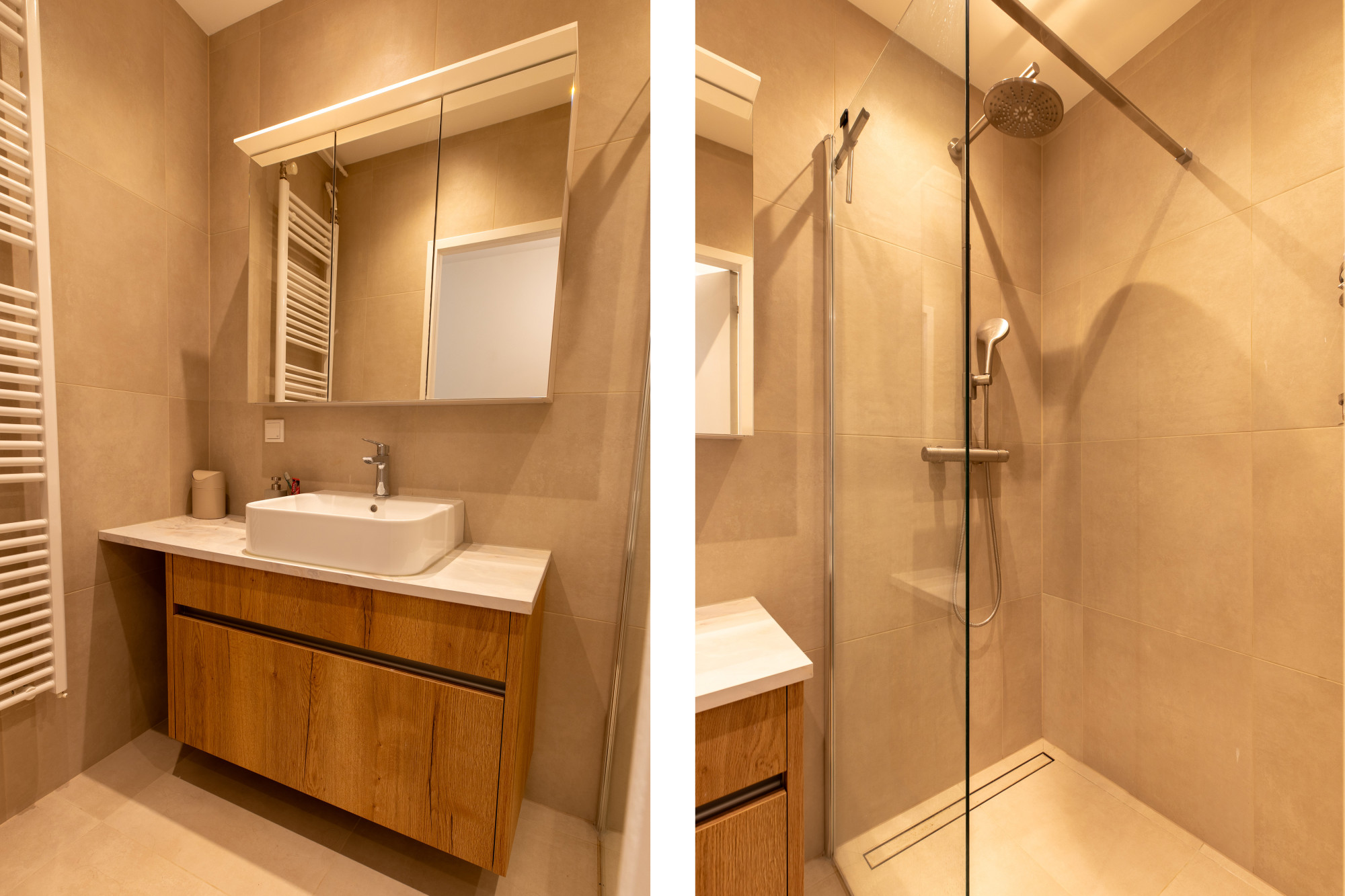 Badkamer (2.25 x 1.33 m) met inloopdouche en badmeubel vaste wastafel.