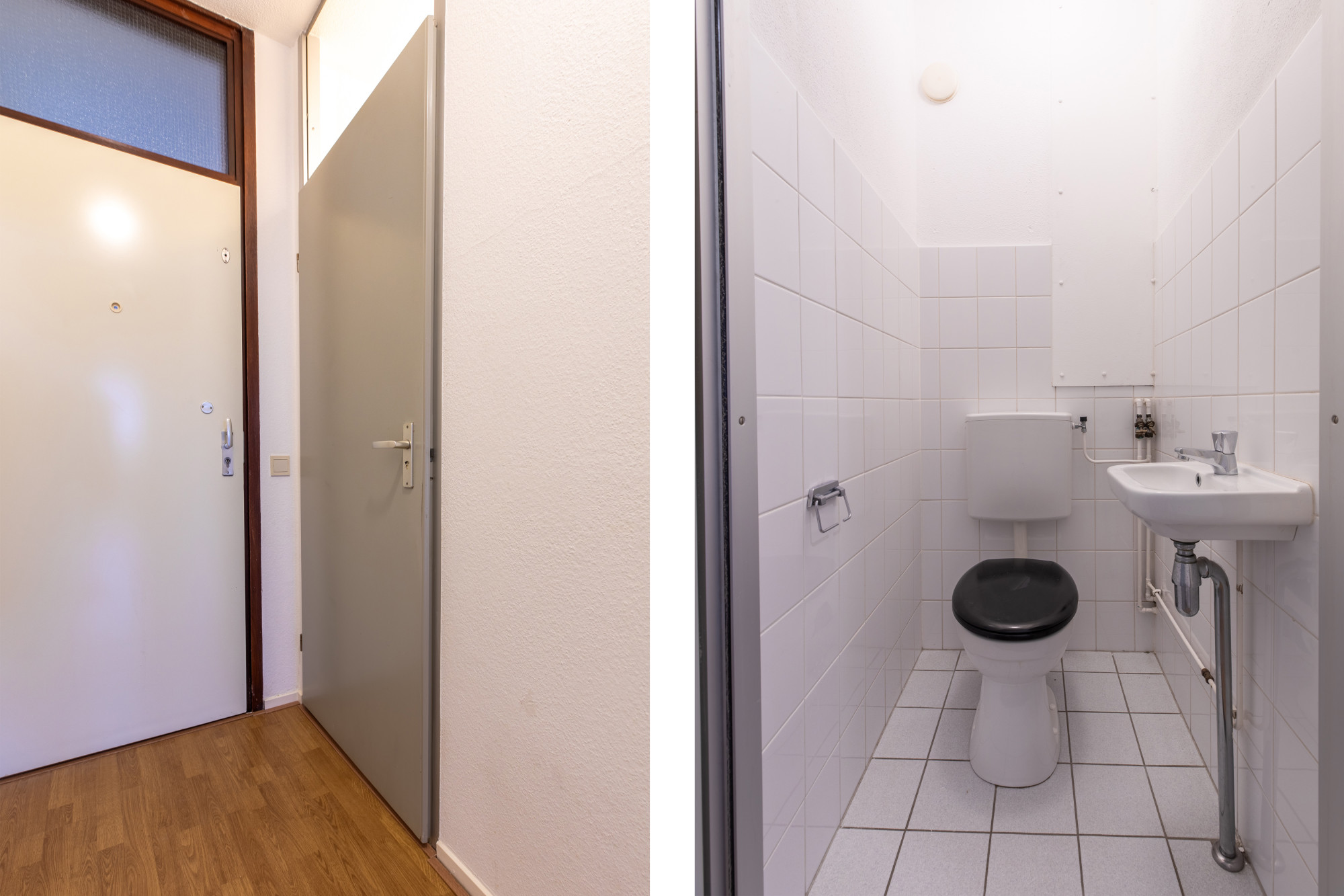Deels betegelde closetruimte met duo closet en fonteintje.