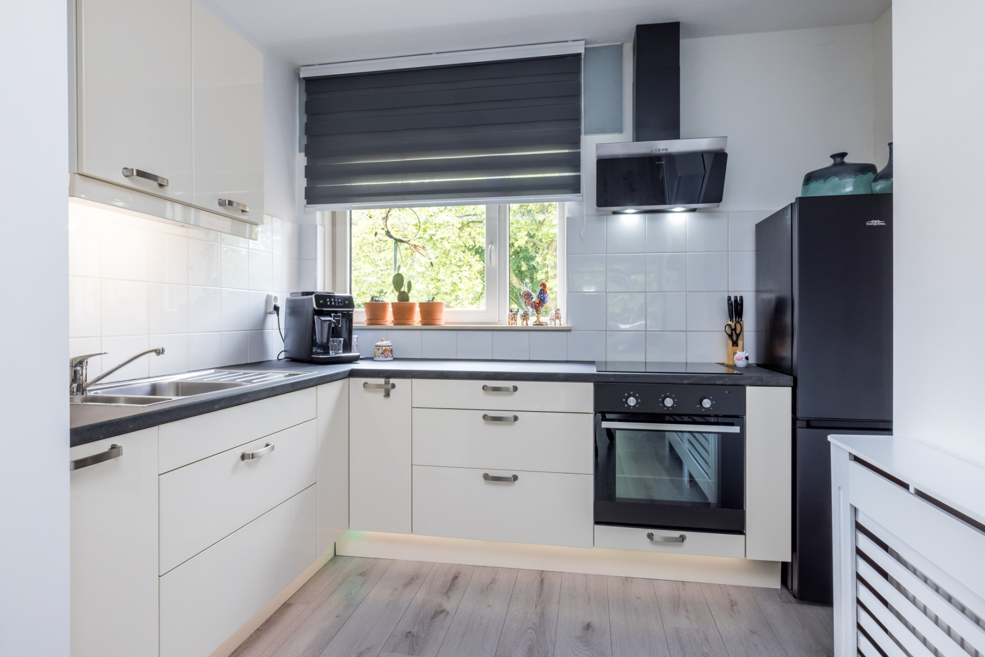 opstelplaats van de HR CV combiketel. Moderne open moderne keuken in hoekopstelling voorzien van een inductiekookplaat, oven en afzuigkap.