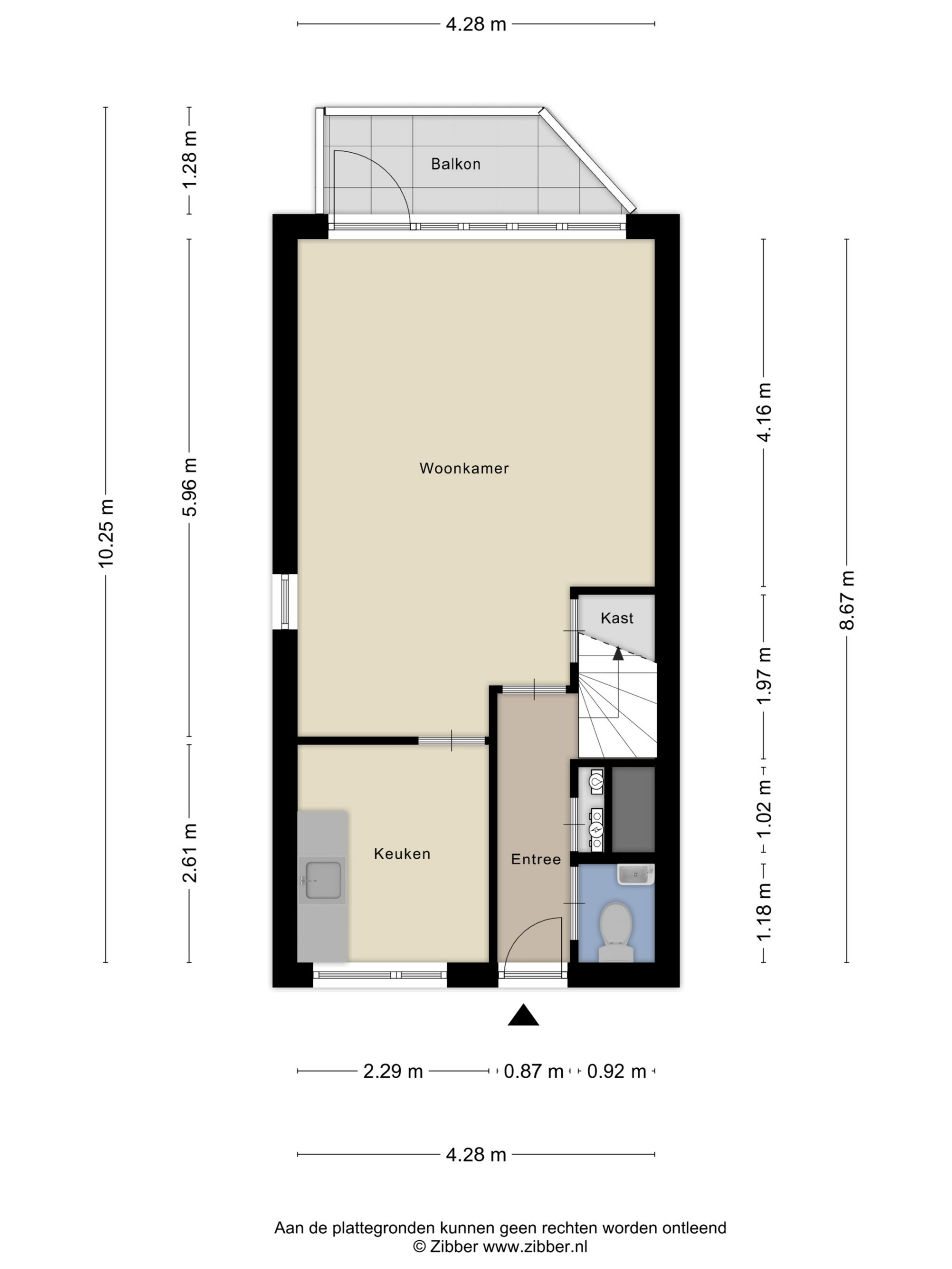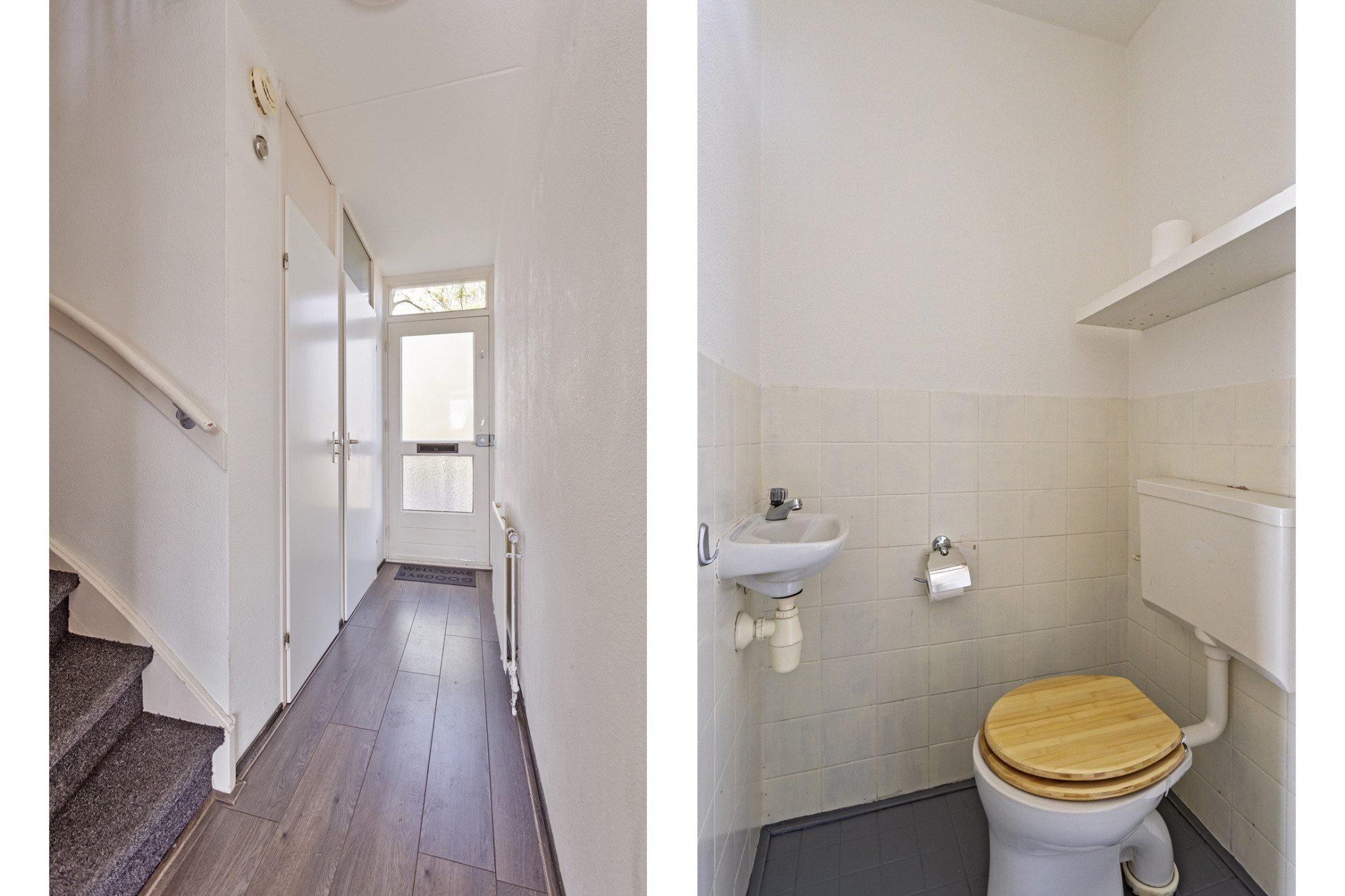 ruimtes: het toilet, de meterkast, de lichte en ruime woonkamer, de keuken, en de trap naar de tweede verdieping.
