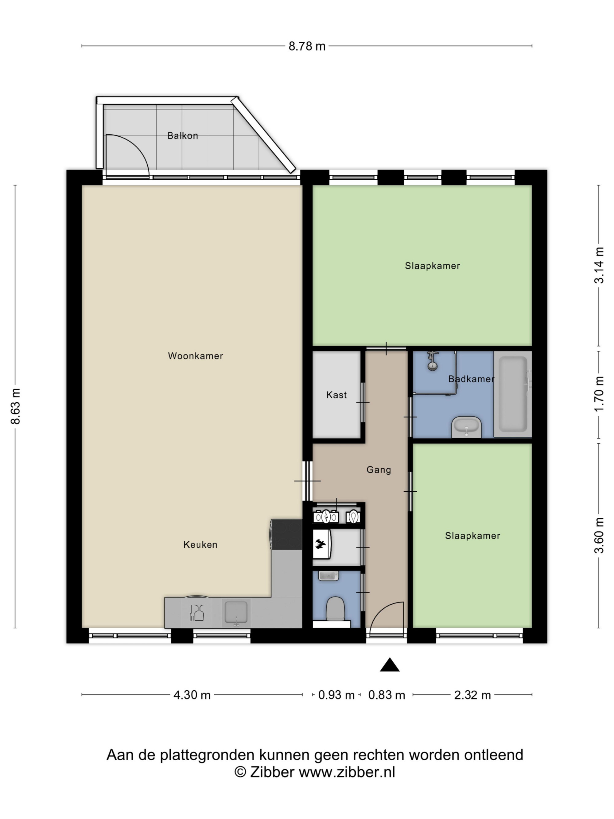 Begane grond: Centrale ingang met toilet, CV-ruimte, opbergkast en doorgang naar de ruime woonkamer, badkamer en twee slaapkamers. De ruime woonkamer is voorzien van keuken en heeft toegang tot het balkon.