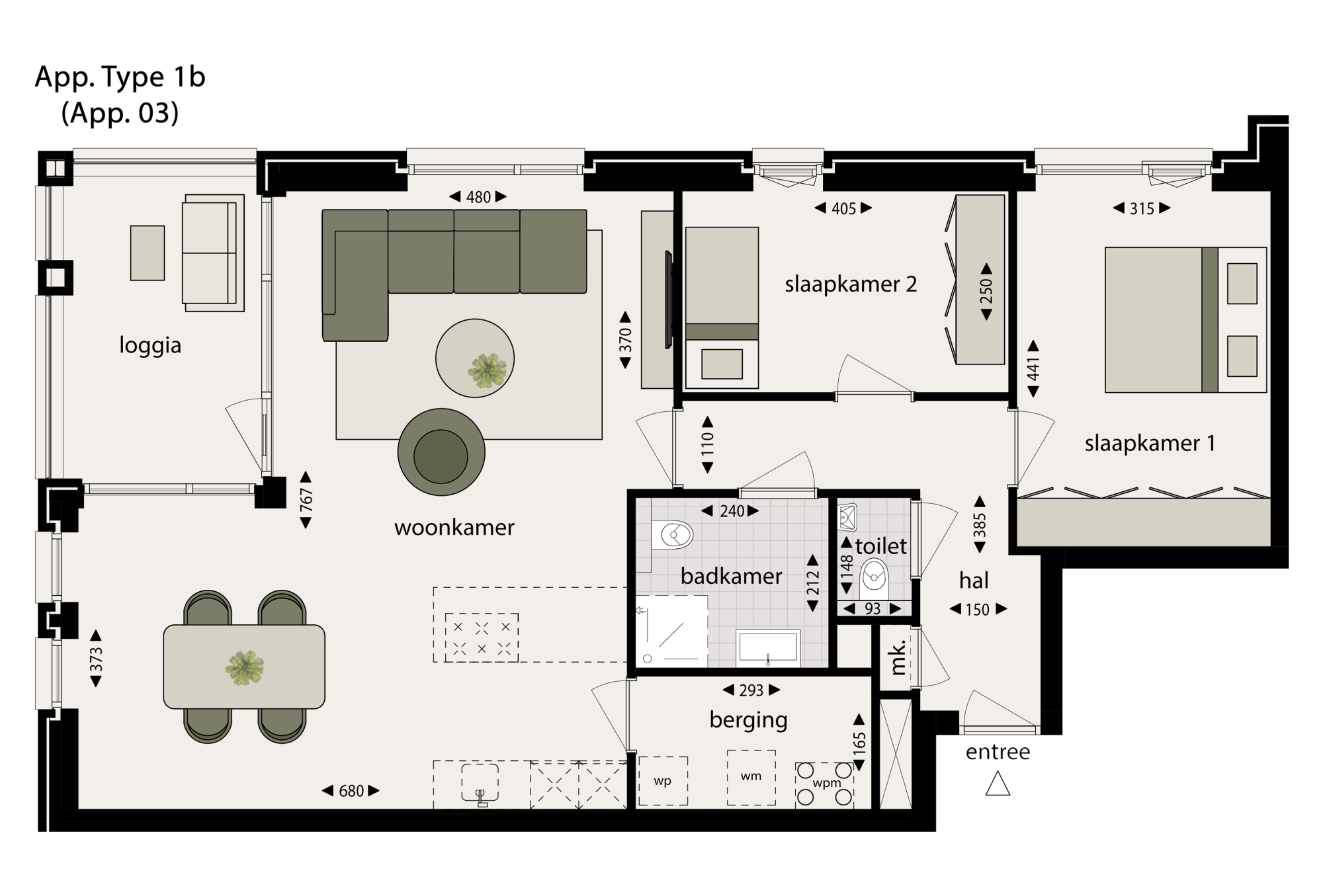 Appartement 1B omvat de appartementen met de appartementsnummers 3, 7 en 11 en zijn gelegen in blok A. Deze plattegronden zijn identiek, met uitzondering van de locatie van de raampartijen. Deze zijn verschillend gesitueerd. De specifieke locatie van de raampartijen staat vermeld op de verkooptekening. De bijgevoegde plattegrond geeft appartement 3 weer.De appartementen zijn circa 91 m² groot en beschikken over een woonkamer met open keuken (het appartement wordt zonder keukenopstelling geleverd), twee slaapkamers, een compleet ingerichte badkamer en een loggia.Ieder appartement beschikt op de begane grond over een eigen berging, uitgerust met een wandcontactdoos voor o.a. het opladen van e-bikes. Daarnaast is er op de begane grond een gezamenlijke fietsenstalling beschikbaar. Parkeren is voorzien op het buitenterrein, waarbij ieder appartement een eigen parkeerplaats heeft.Prijs € 451.000,- V.O.N.