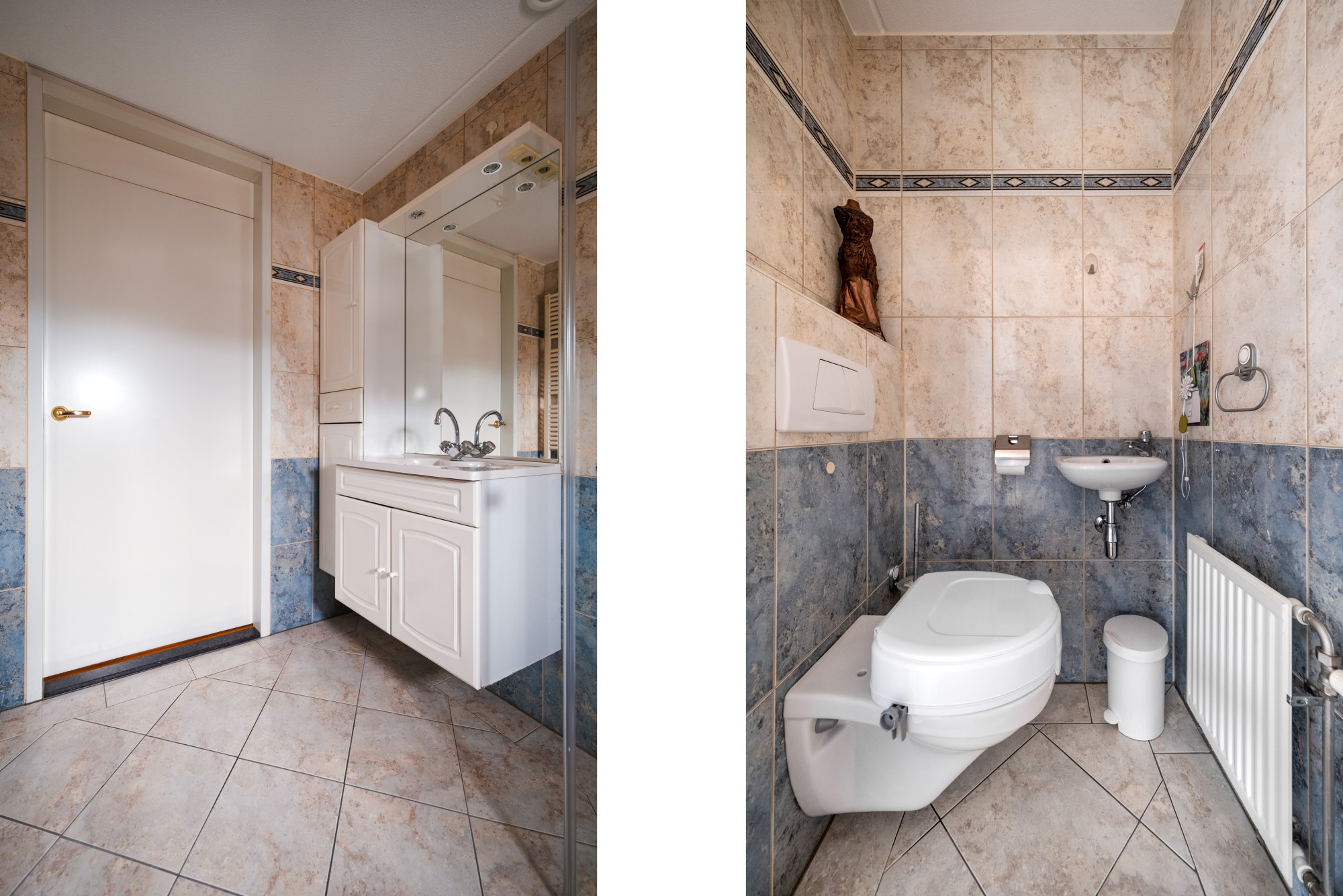 Geheel betegelde toiletruimte met zwevend closet en fontein.