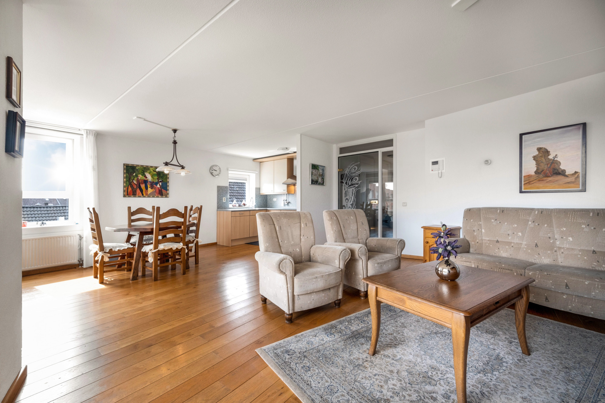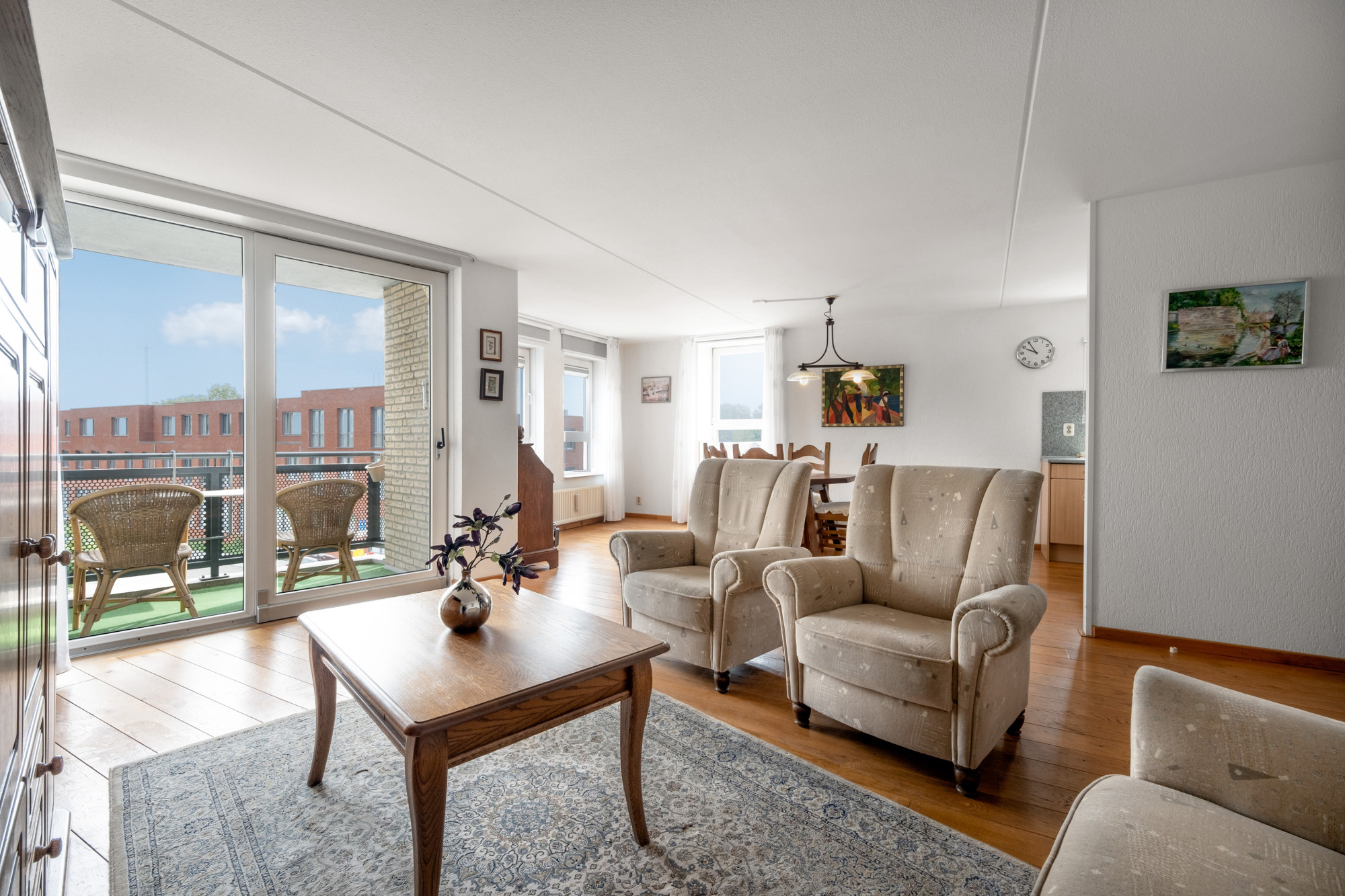 Woon/eetkamer biedt middels een schuifpui toegang tot het overdekt balkon (ca. 1.49m x 2.50m).