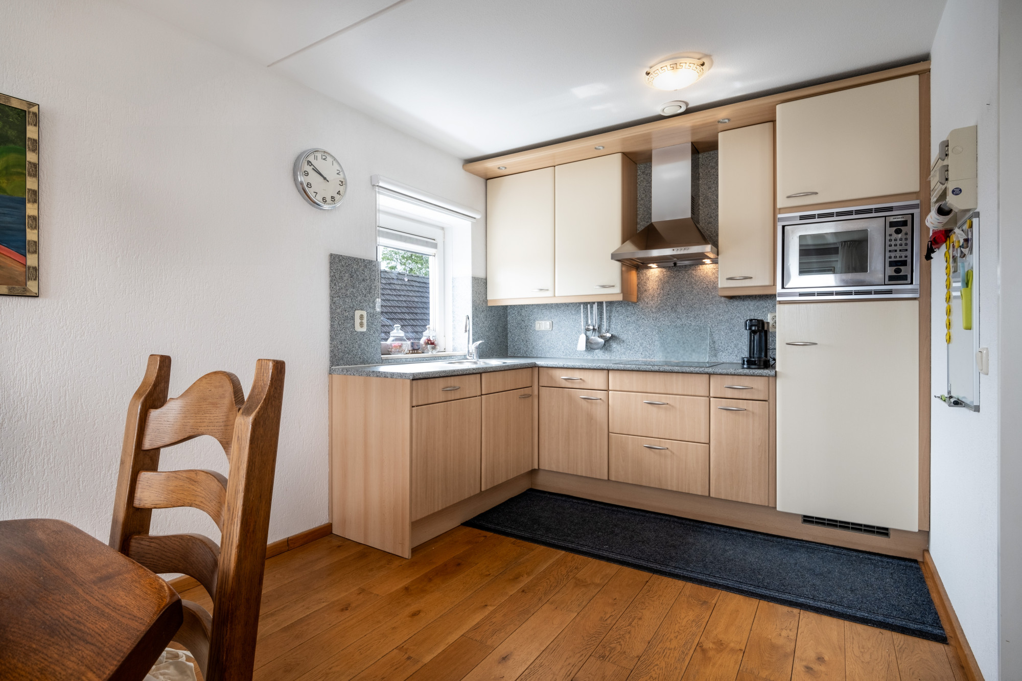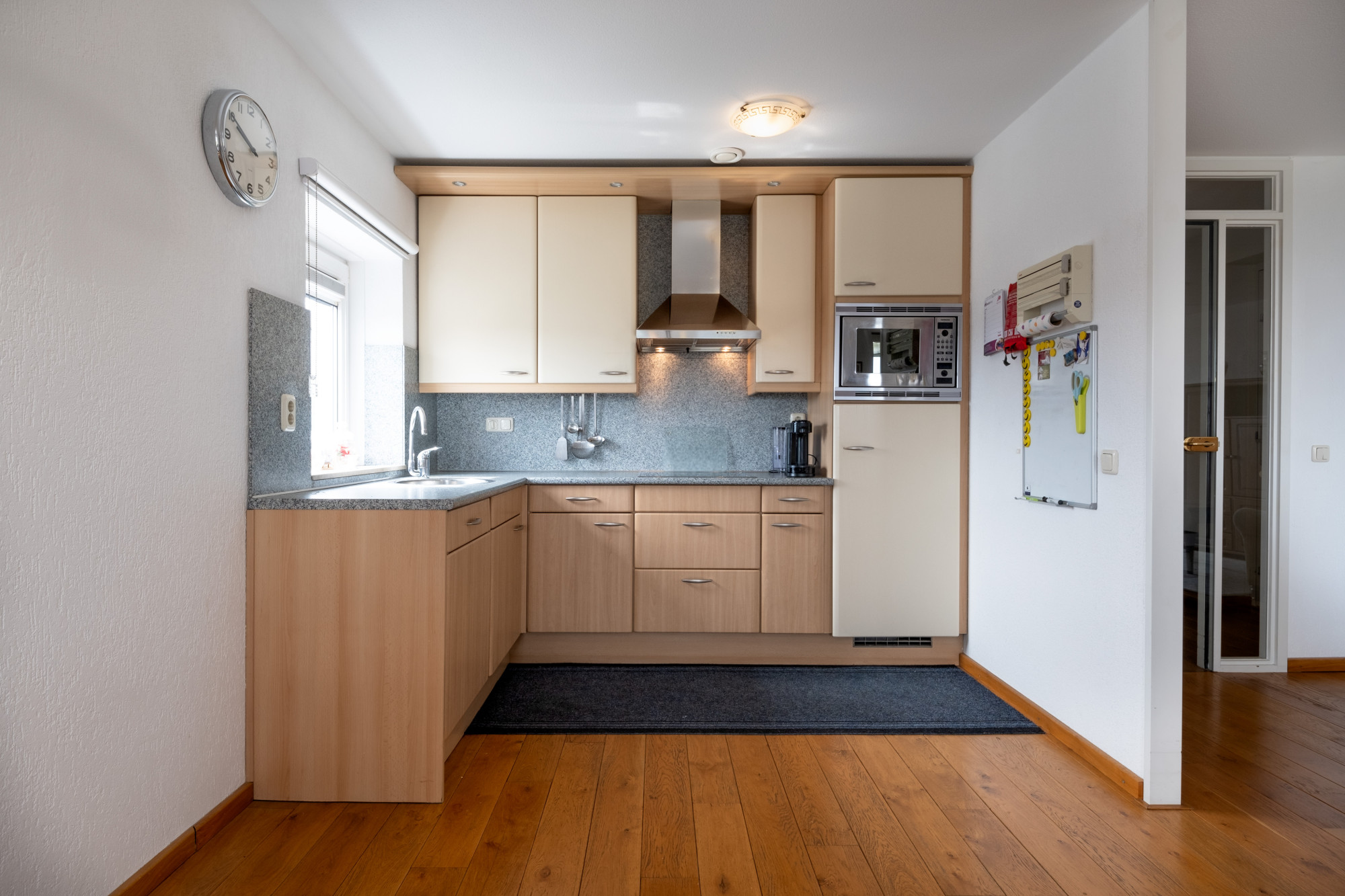 Keuken in hoekopstelling voorzien van 4-pits keramische kookplaat, vaatwasser, oven, koelkast en afzuigkap.