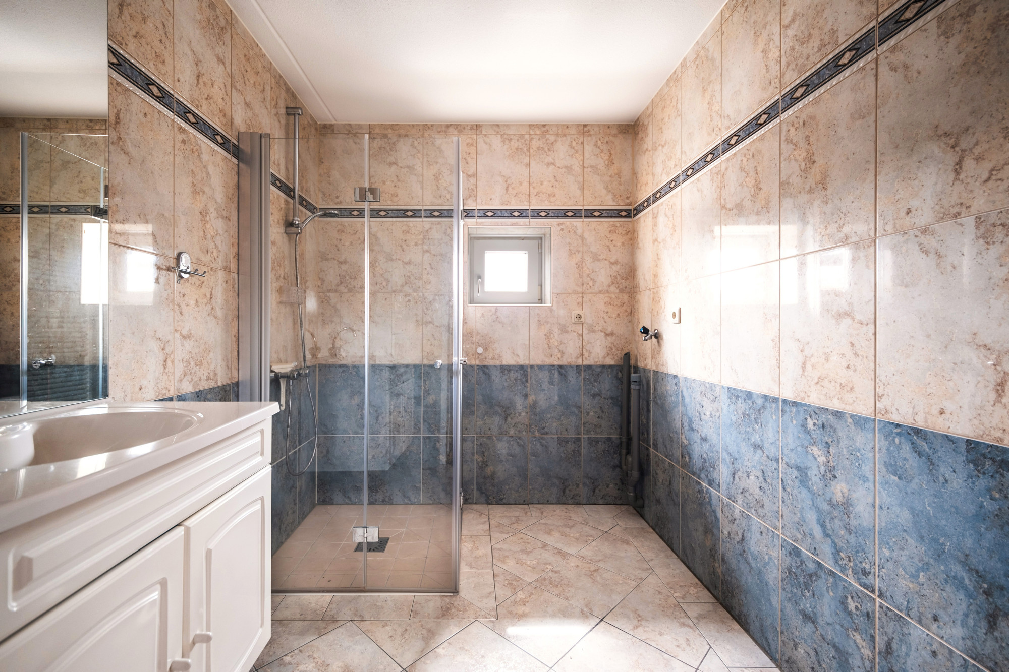Geheel betegelde badkamer (ca. 3.04m x 1.99m) voorzien van douche, badmeubel en witgoedaansluitingen.