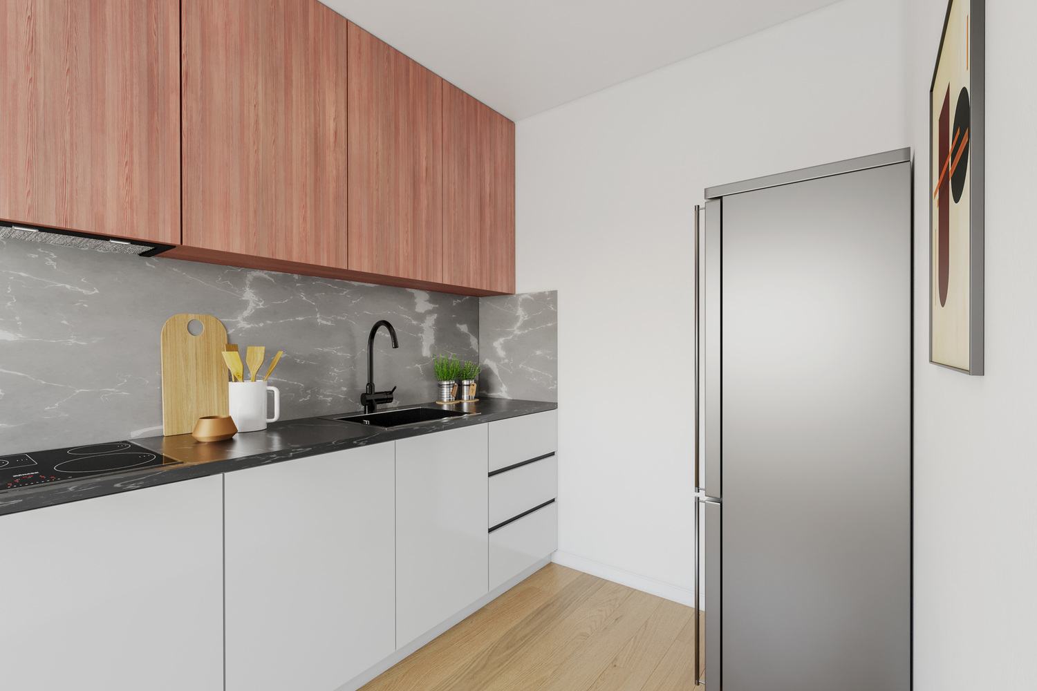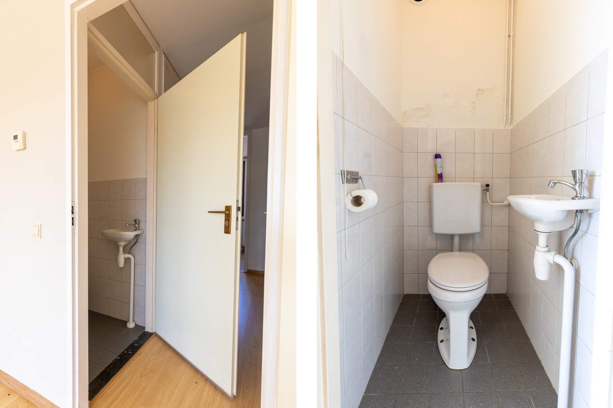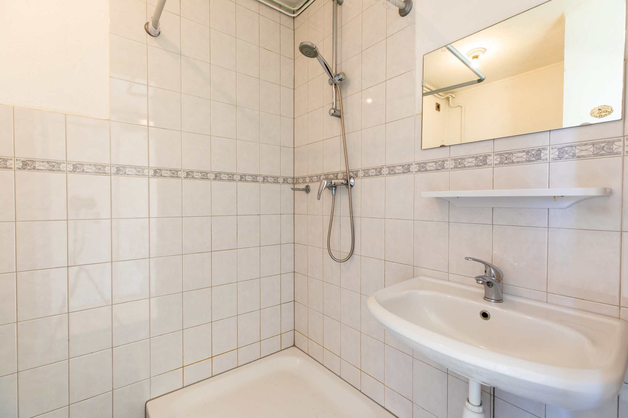 Badkamer met douche en wastafel en witgoed aansluiting. Separate toiletruimte voorzien van toilet en fonteintje.