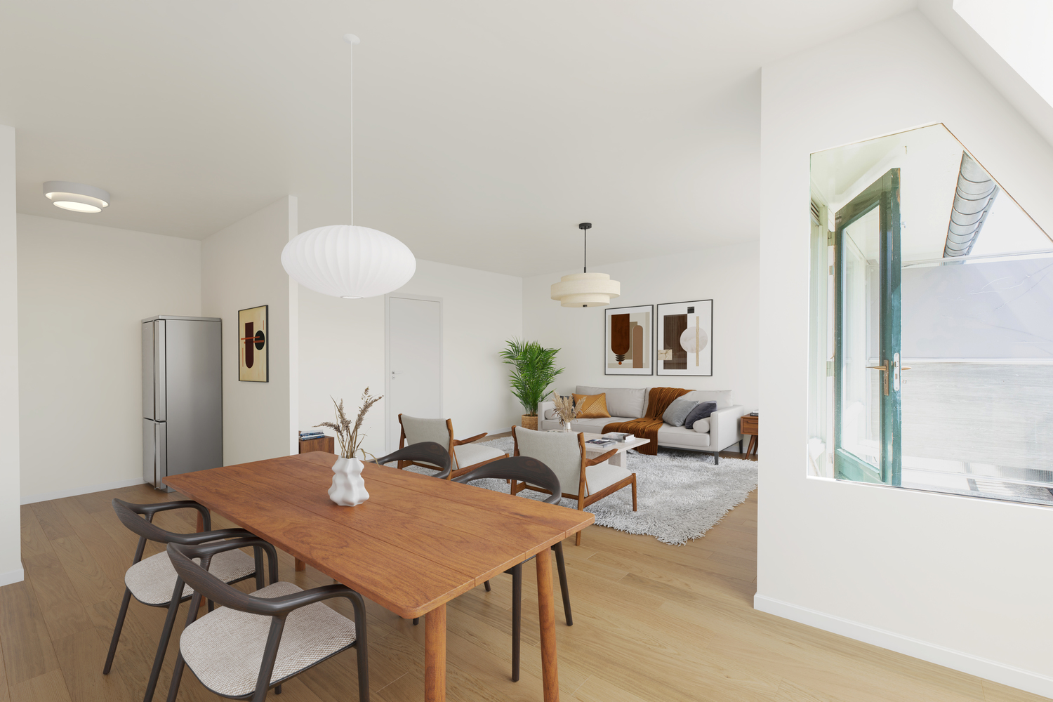 Hal met toegang alle ruimtes. Woonkamer met toegang balkon. Keukenblok