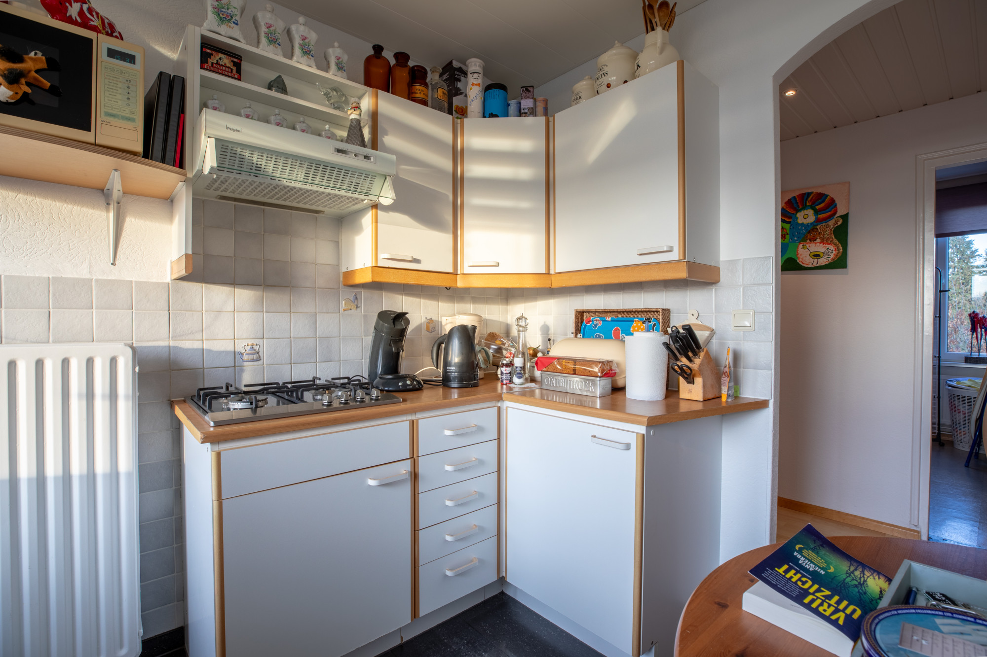 Gesloten keuken met keukeninstallatie met diverse onder- en bovenkasten, inbouwapparatuur te weten: 4-pits gascomfort en afzuigkap. Bijkeuken met witgoedaansluiting en CV installatie.